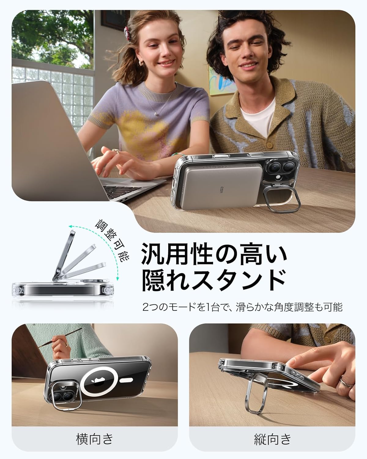 【受賞デザインスタンド!視聴も配信も自在】「スタンドケース、便利だけど邪魔じゃない?」いいえ、このスタンドは隠蔽式です!必要な時だけに出し、縦位置・横位置を自由自在に調整可能で、YouTube視聴はもちろん、TikTokやInstagramの縦長動画のライブ配信にも最適です。この独創的なデザインは、フレンチデザインアワード2024ゴールド賞を受賞しました!スタンドを使いながら同時にMagSafe充電もでき、革命的な便利さです