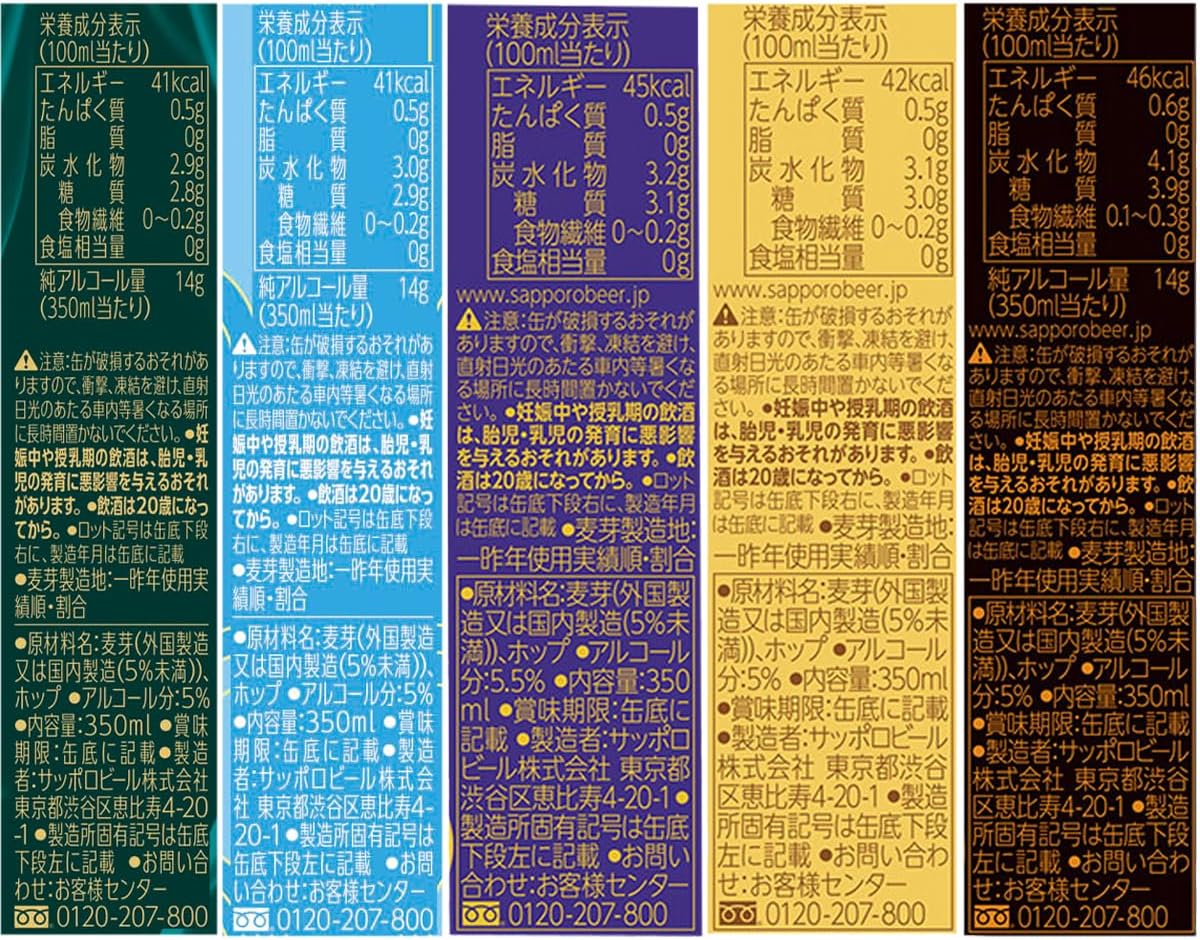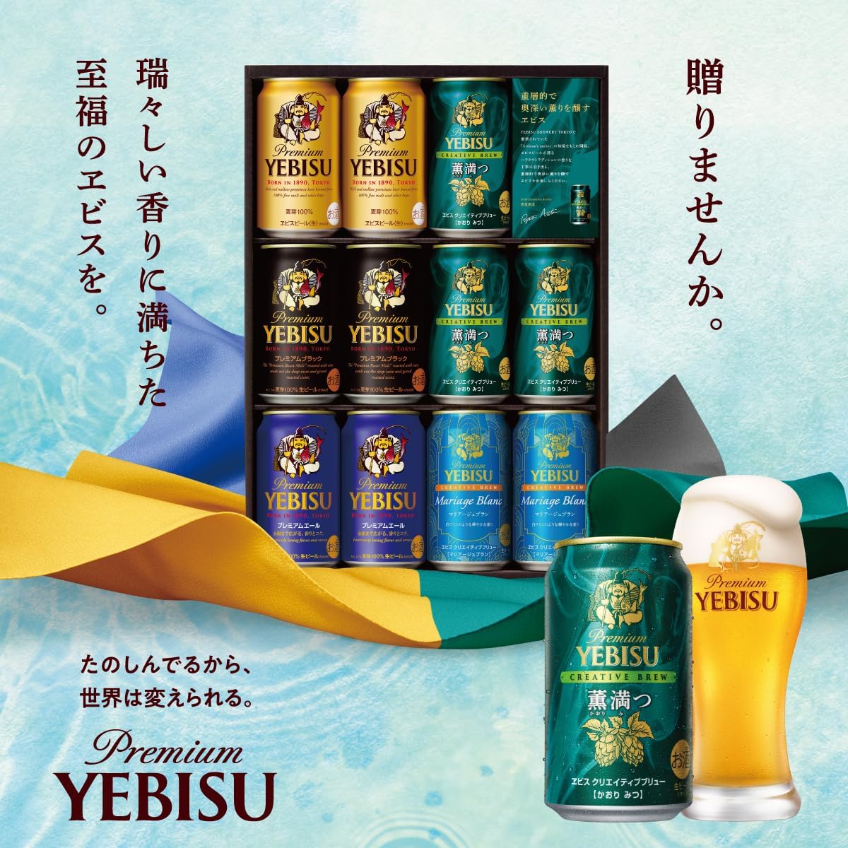 ヱビスビール缶350ml×2本、ヱビス クリエイティブブリューマリアージュブラン缶×350ml×2本、ヱビス クリエイティブブリュー薫満つ缶350ml×3本、ヱビス プレミアムエール缶350ml×2本、ヱビス プレミアムブラック缶350ml×2本