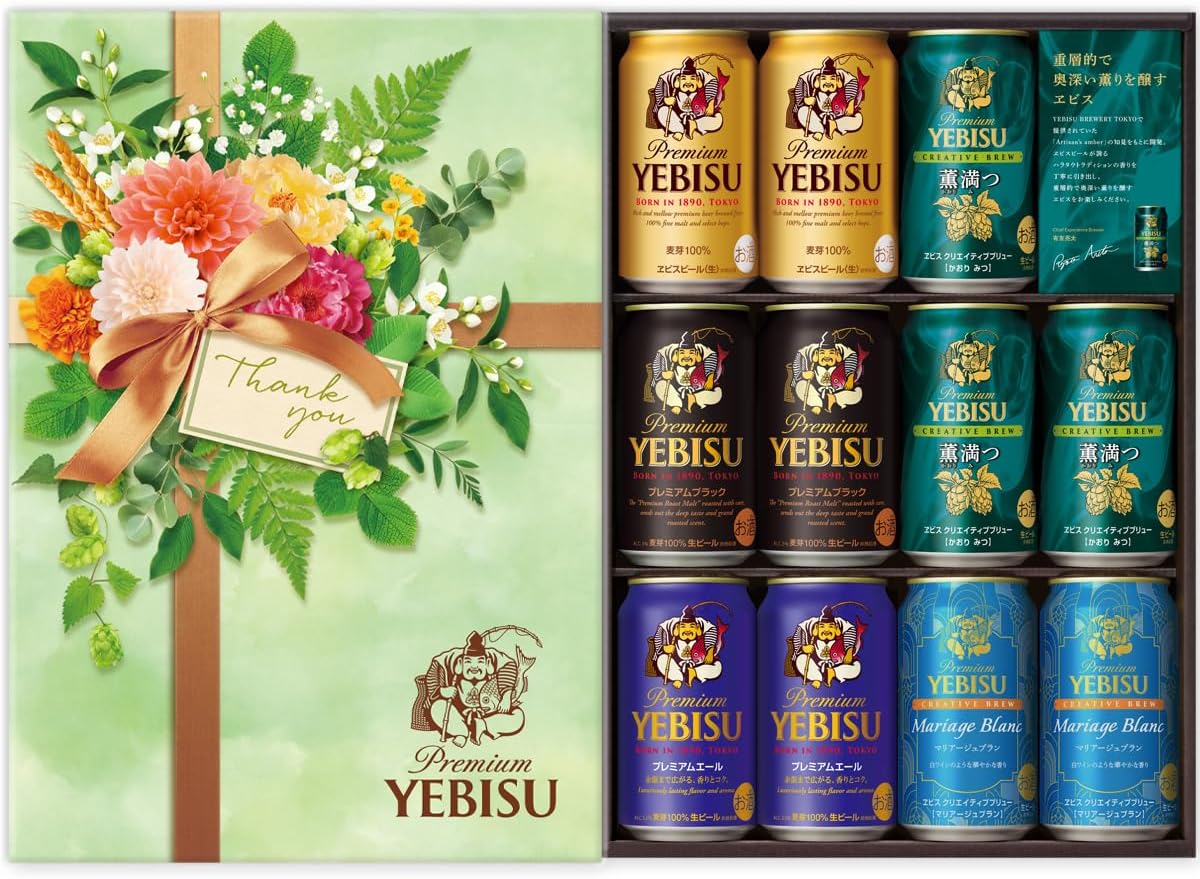 ヱビスビール缶350ml×2本、ヱビス クリエイティブブリューマリアージュブラン缶×350ml×2本、ヱビス クリエイティブブリュー薫満つ缶350ml×3本、ヱビス プレミアムエール缶350ml×2本、ヱビス プレミアムブラック缶350ml×2本