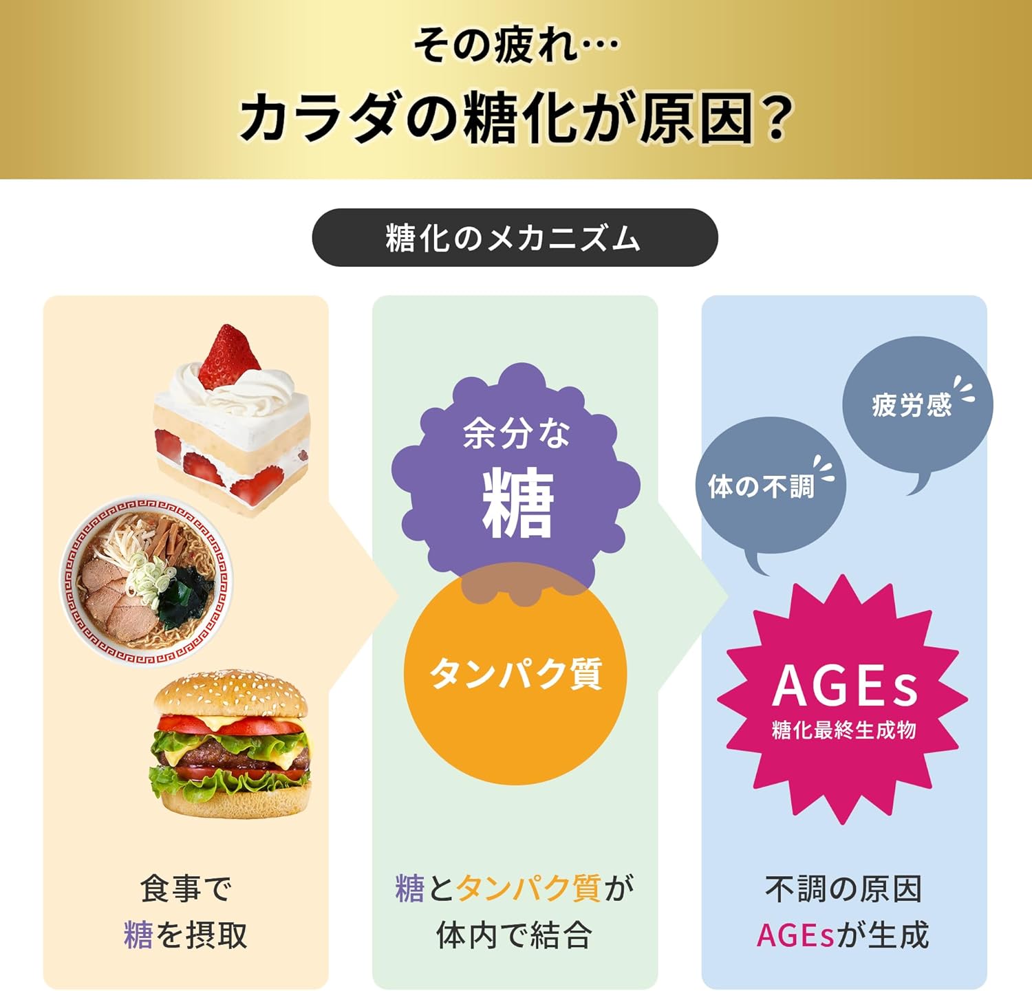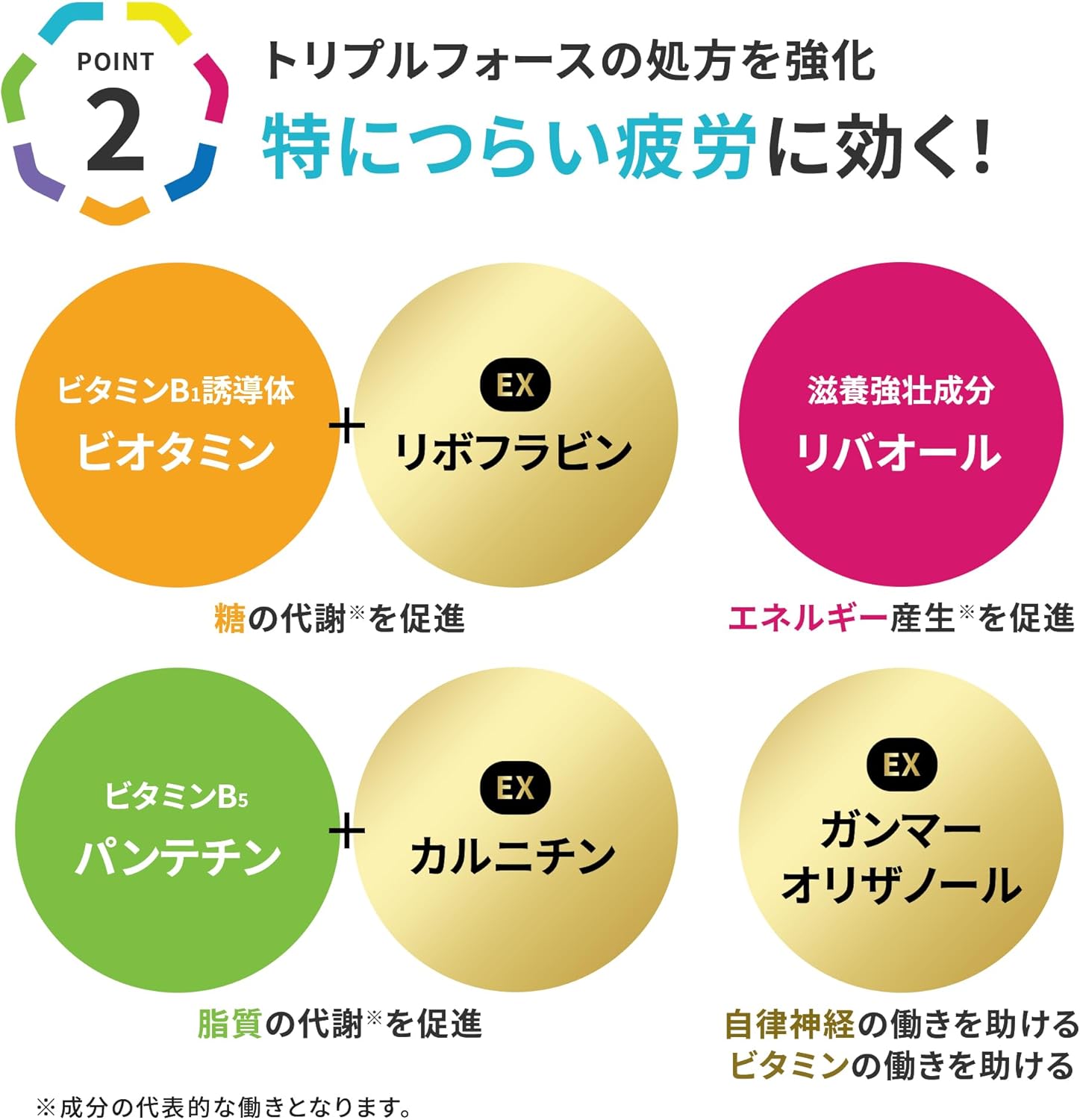 ✅トリプルフォースは、疲れと糖化の関係に着目して開発。糖の代謝と関わりの深い成分[リバオール][ビオタミン]を配合しました。トリプルフォースEXには、さらに[ガンマ-オリザノール]と[リボフラビン]を配合し、糖の代謝をサポートします。