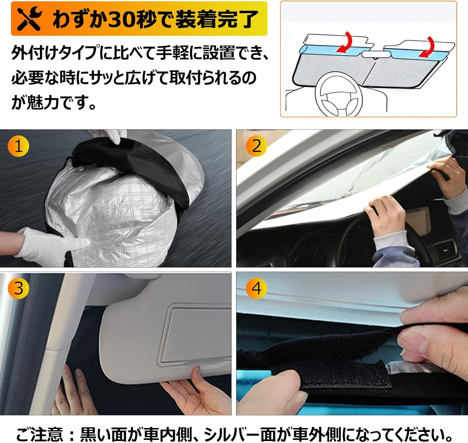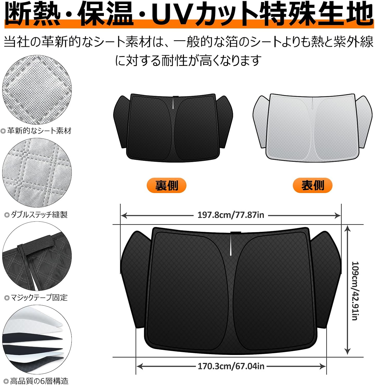 【強化版6層構造&次世代の特殊生地】1層目:高品質高密度アルミ遮熱シート、2層目:高品質高密度アルミ遮熱シート、3層目:ポリウレタン断熱素材、4層目:ポリウレタン断熱素材、5層目:高品質高密度アルミ遮熱シート、6層目:ポリウレタン断熱素材。洗練されたスタイリッシュなシルバー面、太陽光を強烈にはね返します。普通のサンシェードは材質が薄く、遮光性が弱い。本製品は厚い銀生地が採用され、遮光率がアップ。なお、普通のは銀色の面が内装と擦れる事で内装に色写りします。