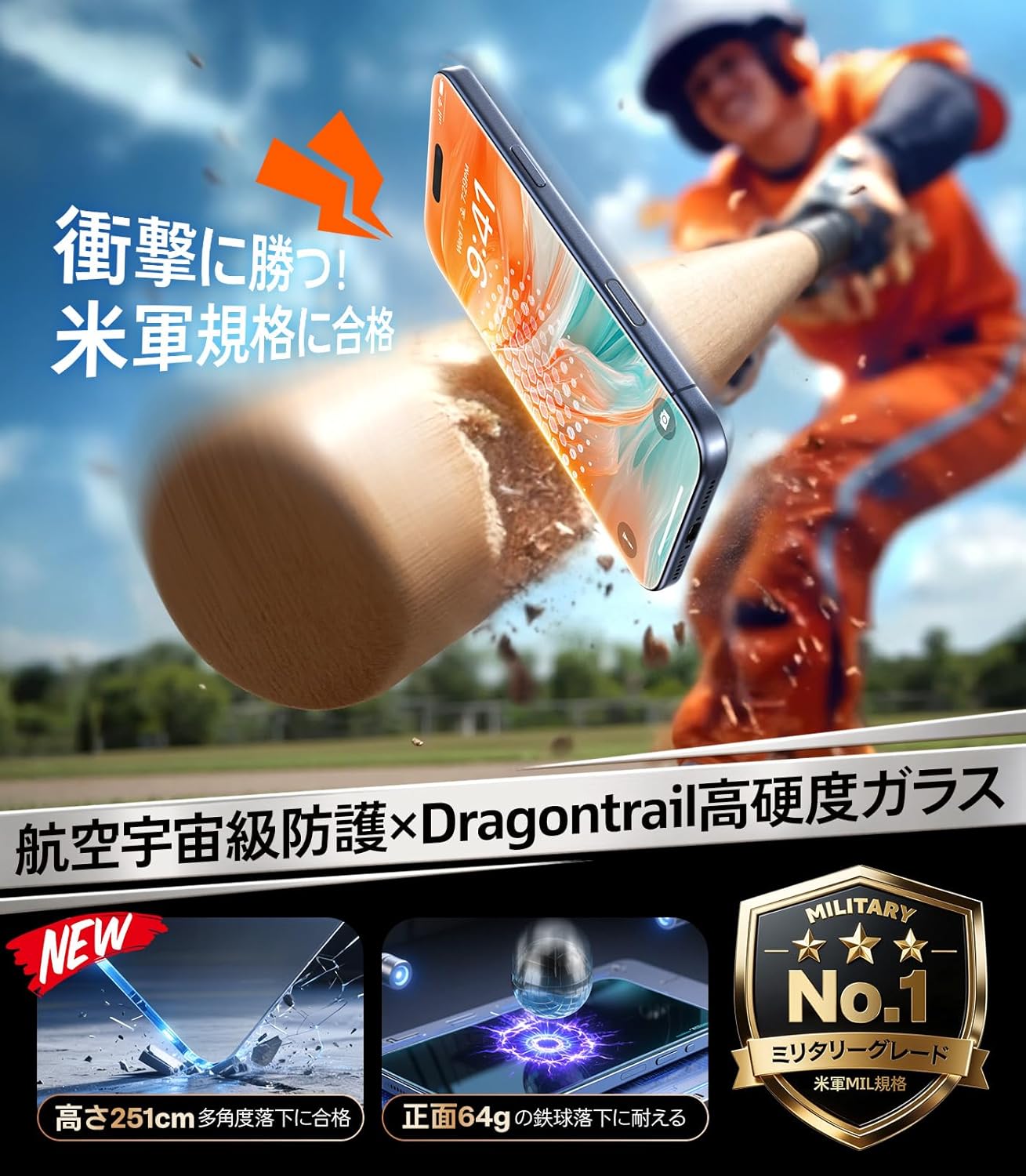 【世界が認めた Dragontrail ガラスで、画面を鉄壁防護】使用されているのは、日本 AGC 製「Dragontrail」ガラスフィルム。航空宇宙技術を応用し、9H を超える Hv673 の硬度を実現。耐衝撃性は市販品の約 3 倍で、日常の落下・摩擦から画面を徹底守る。世界 30 カ国で 9600 万枚突破の実績、“画面破損ゼロ” の信頼性。TORRAS iPhone 2025(6.3 インチ)用のケースとの併用で、まさに鉄壁の防御力を実現する。