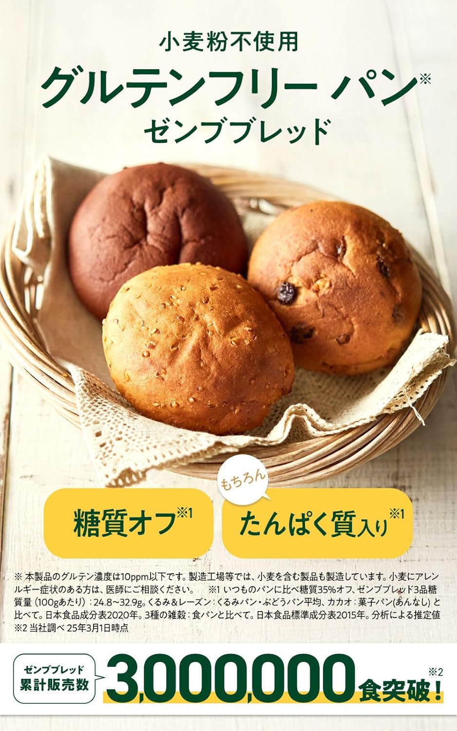 🍞【糖質オフ*1&グルテンフリー*2】余計なものは加えず、素材のおいしさを活かしました。小麦粉不使用*2 、卵、バター、乳製品などの動物性原料も加えていません*2 。白砂糖も使わず、てんさい糖を使用しています。( *1 いつものパンに比べて26%オフ ゼンブブレッド6品糖質量(100gあたり):24.8~38.8g。くるみ&レーズン:くるみパン・ぶどうパン平均、カカオ・紅茶&オレンジ・金時豆:菓子パン(あんなし)、きなこあん:菓子パン(こしあん入り)と比べて。日本食品成分表2020年。3種の雑穀:食パンと比べて。日本食品標準成分表2015年。分析による推定値。*2: 本製品はグルテン濃度を10ppm以下で管理しています。製造工場等では、特定原材料8品目中、くるみ・小麦・卵・乳成分を含む製品も製造しています。これらにアレルギー症状のある方は、医師にご相談ください。)