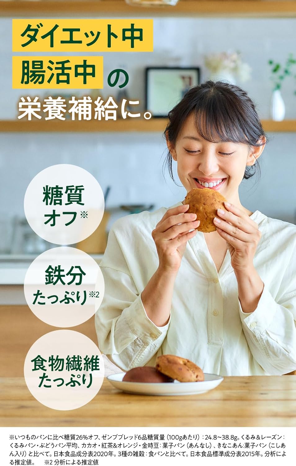 🍞【1袋=食パン約1枚分 小腹がすいた時に】ゼンブブレッドの重量は食パン(6枚切り)約1枚分*4。毎日の朝食、いつものパンの代わりにゼンブブレッドにするだけで、糖質35%オフさらに不足しがちな栄養補給*5にもぴったり。(*4 食パン6枚切り 1枚57g、ゼンブブレッド 1個53g(きなこあんは56g) 、*5 食物繊維、鉄分のこと)