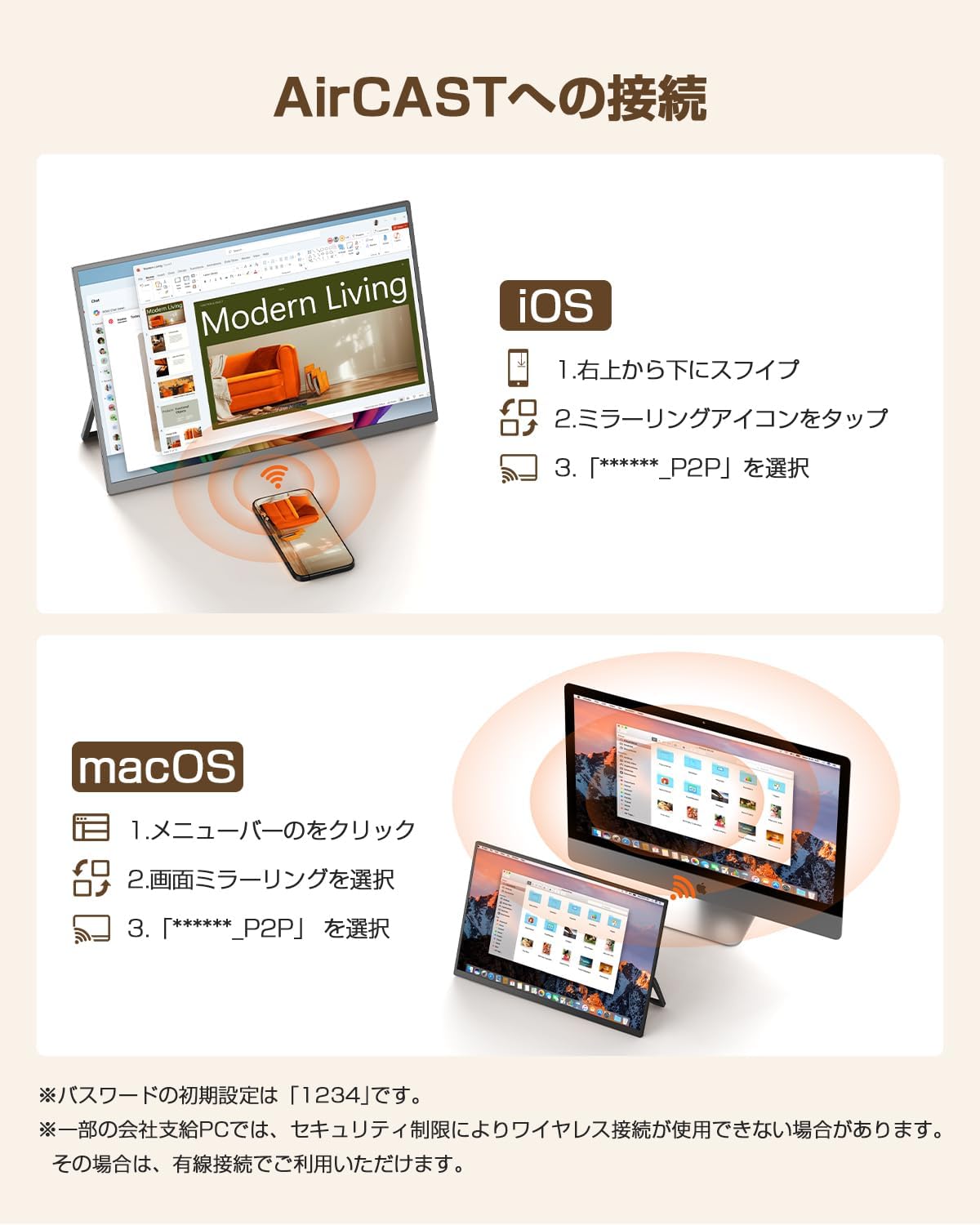 【対応デバイスとご利用上のご案内】本製品はワイヤレス接続・有線接続の両方に対応しています。快適にご使用いただくため、以下をご確認ください。 ✅ 主な対応デバイス ・iPhone / iPad / Mac(AirPlay対応モデル) ・Androidスマートフォン / タブレット(Miracast・各社ミラーリング機能対応モデル) ・Windows 10 / 11 搭載PC(ワイヤレスディスプレイ機能対応) ・Nintendo Switch / PS5 / PS4(HDMI接続) ⚠️ ご利用いただけない可能性がある機器 ・Windows 7 搭載PC ・性能が低い旧型パソコン ・ミラーリング機能を搭載していない一部Android端末 💡 より快適にご使用いただくために、ワイヤレス表示は、接続機器の性能や通信環境の影響を受ける場合があります。用途に応じてUSB-CやミニHDMI接続もご利用いただけます。
