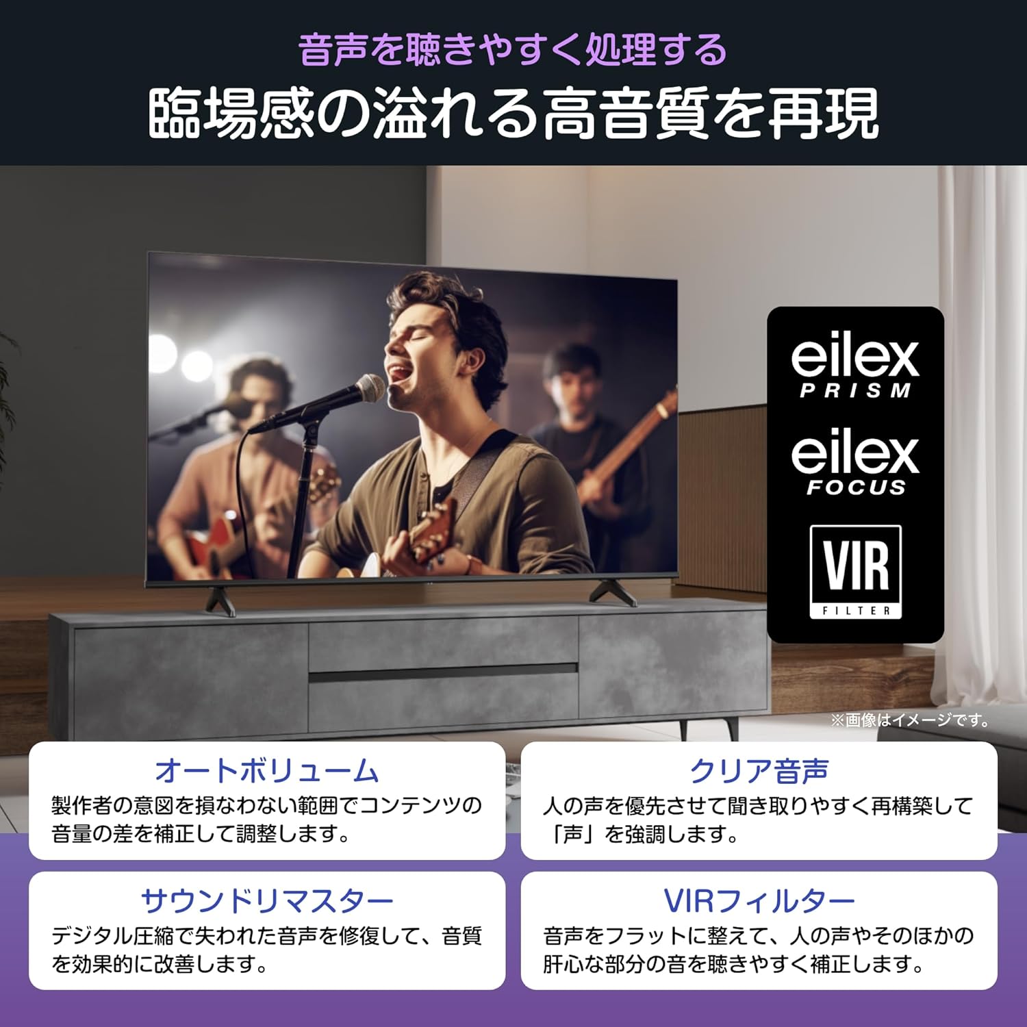 AI自動モードに加え、ダイナミック、クリア音声、スポーツ、映画など多彩な音質モードを搭載。