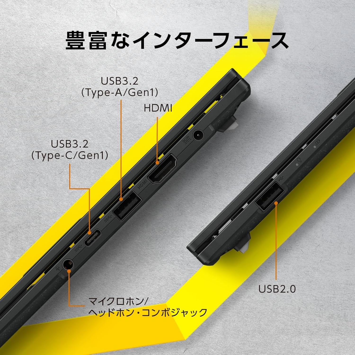 【USBポート】USB3.2 (Type-C/Gen1)×1 ※データ転送をサポート、USB3.2 (Type-A/Gen1)×1、USB2.0×1【オーディオ】ステレオスピーカー内蔵 (2W×2)、アレイマイク内蔵、マイクロホン/ヘッドホン・コンボジャック×1【通信機能】無線:IEEE802.11a/b/g/n/ac/ax (Wi-Fi 6E), Bluetooth 5.1