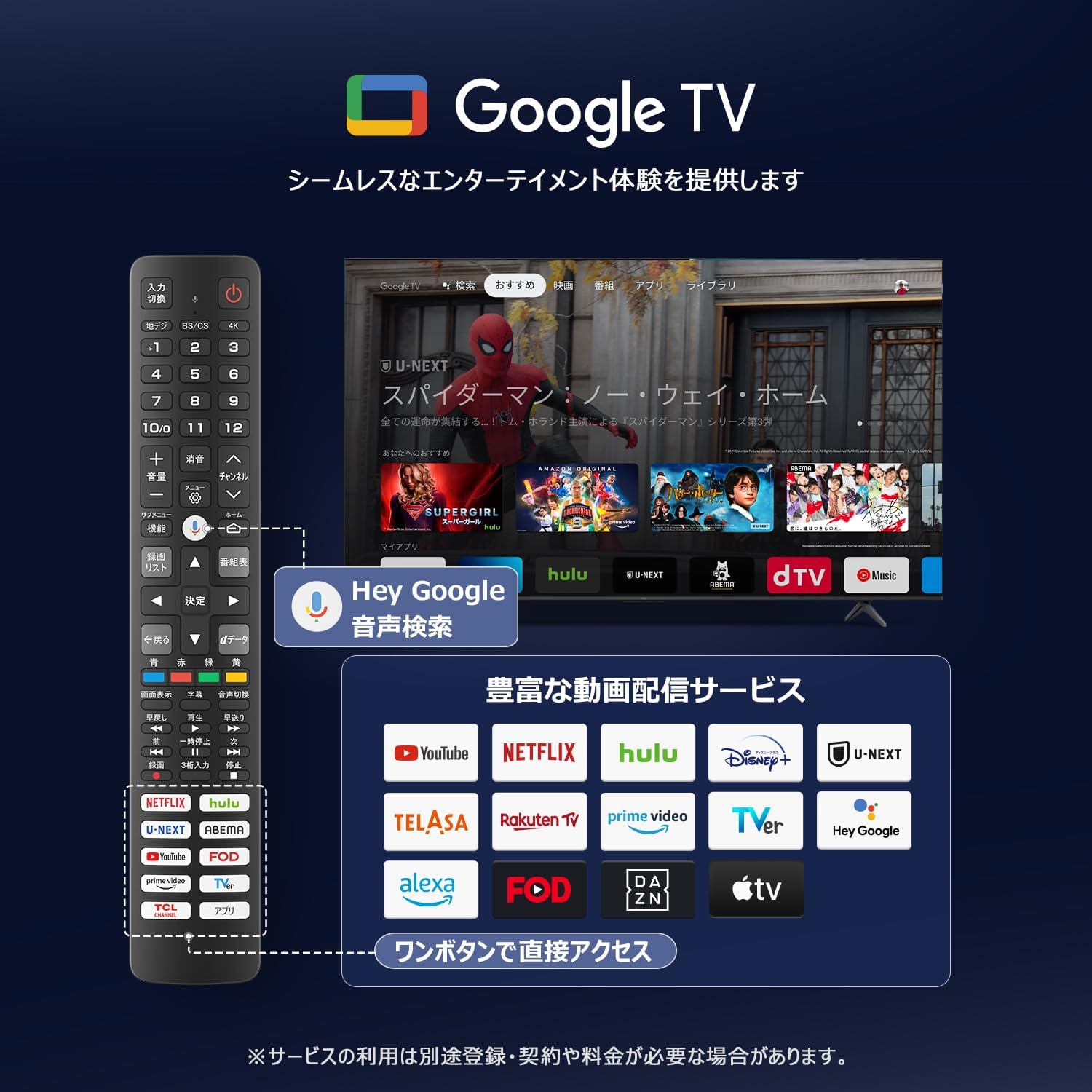 【Google TV搭載・Airplay2 クロームキャスト内蔵】Googleテレビには、YouTube、Amazonプライムビデオ、Netflix、Hulu、Disney+、Apple TV+、U-NEXTなど、豊富なコンテンツが搭載されています。アプリ数が非常に多く、スポーツ、音楽、ゲームなど、さまざまなコンテンツを楽しめます。Googleアカウントを登録するだけで、Google AIがユーザーの視聴履歴や好みに基づいておすすめのコンテンツをホーム画面に表示します。また、Airplay 2とクロームキャスト機能が内蔵されているため、スマートフォンで視聴している映像やゲームをテレビの大画面で快適に楽しめます。さらに、Alexa やGoogle アシスタントの音声操作にも対応しているので、声だけで簡単に操作することができます。