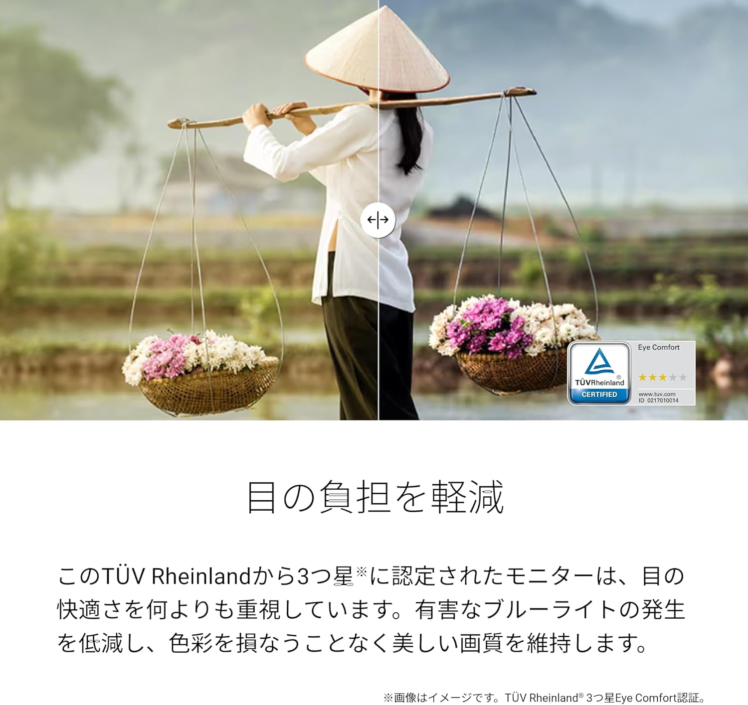 【目の負担を軽減】このTÜV Rheinlandから3つ星に認定されたモニターは、目の快適さを何よりも重視しています。有害なブルーライトの発生を低減し、色彩を損なうことなく美しい画質を維持します。