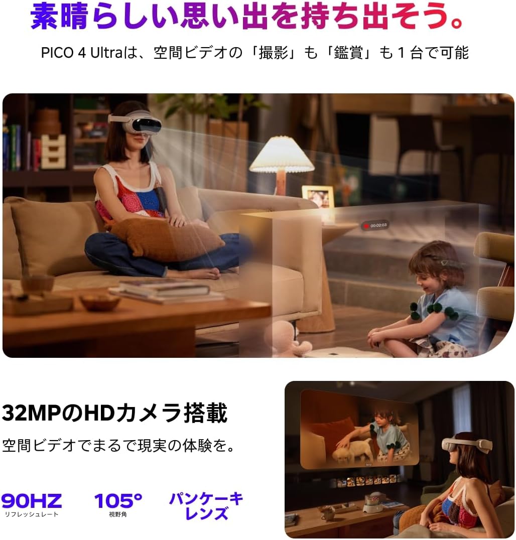 【思い出を立体的に残せる空間ビデオ】家族旅行や子どもの成長など、大切な瞬間を立体的に記録。従来の写真や動画とは比較にならない臨場感で、まるでタイムスリップしたかのように思い出を再体験できます。思い出の保存方法が、PICO 4 Ultraで一変します。