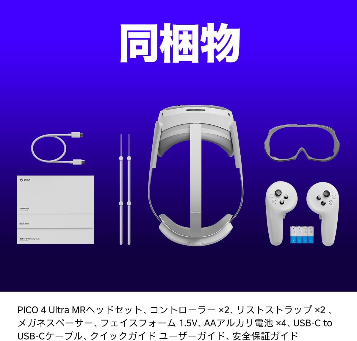 PICO 4 Ultra MRヘッドセット、コントローラー ×2、リストストラップ ×2、メガネスペーサー、フェイスフォーム、1.5V AAアルカリバッテリー ×2、USB-C to USB-Cケーブル、クイックガイド、ユーザーガイド、安全性と保証ガイド