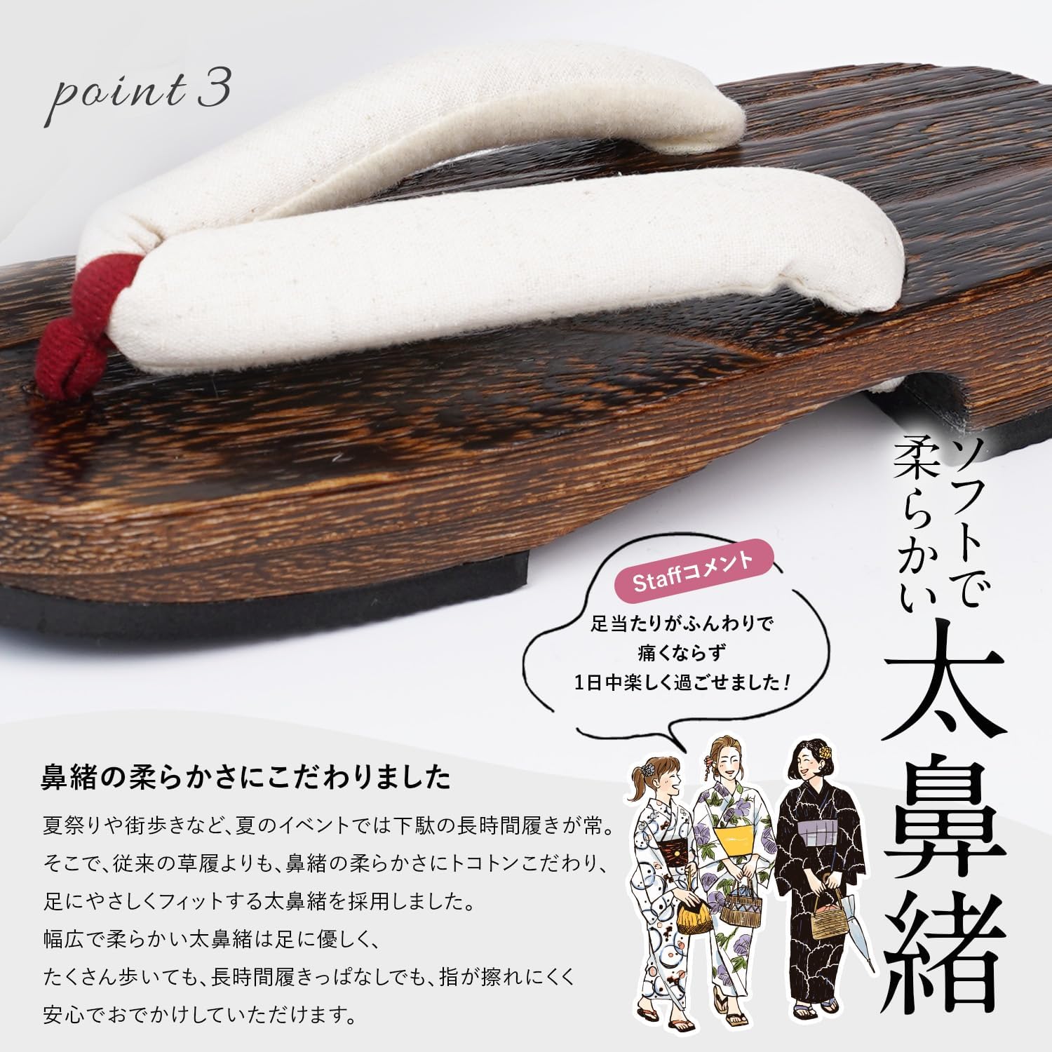 幅広で柔らかい太鼻緒は足に優しく、たくさん歩いても、長時間履きっぱなしでも、