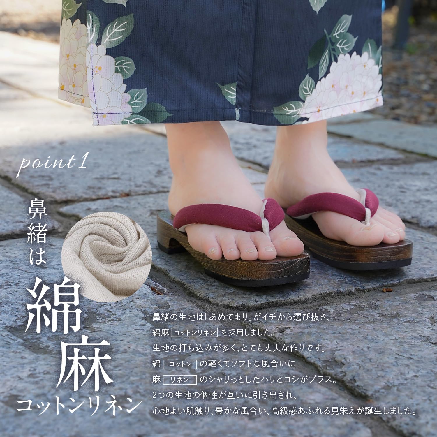 綿麻素材はアパレルの洋服にも良く使われる上質な素材。鼻緒も無地でシンプルなので普段履きにもオススメです。