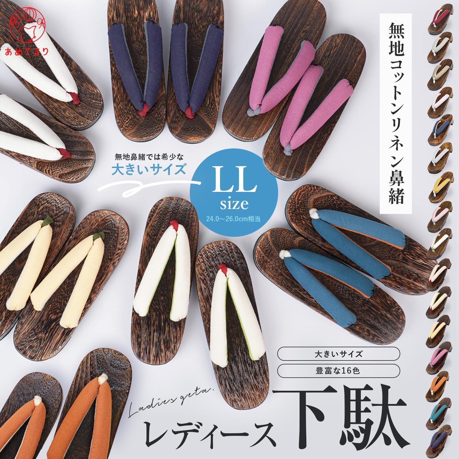 [あめてまり] 下駄 レディース 浴衣 大きめ 浴衣下駄 2L寸 (24.0~26.0cm) 夏 綿麻無地鼻緒 痛くない 太鼻緒 ふわふわ鼻緒 幅広 小判型 ふっくら 大きいサイズ 安定感 婦人 女性 くすみカラー 右近型 ゲタ 普段履き サンダル 夏祭り Amazonで販売中
