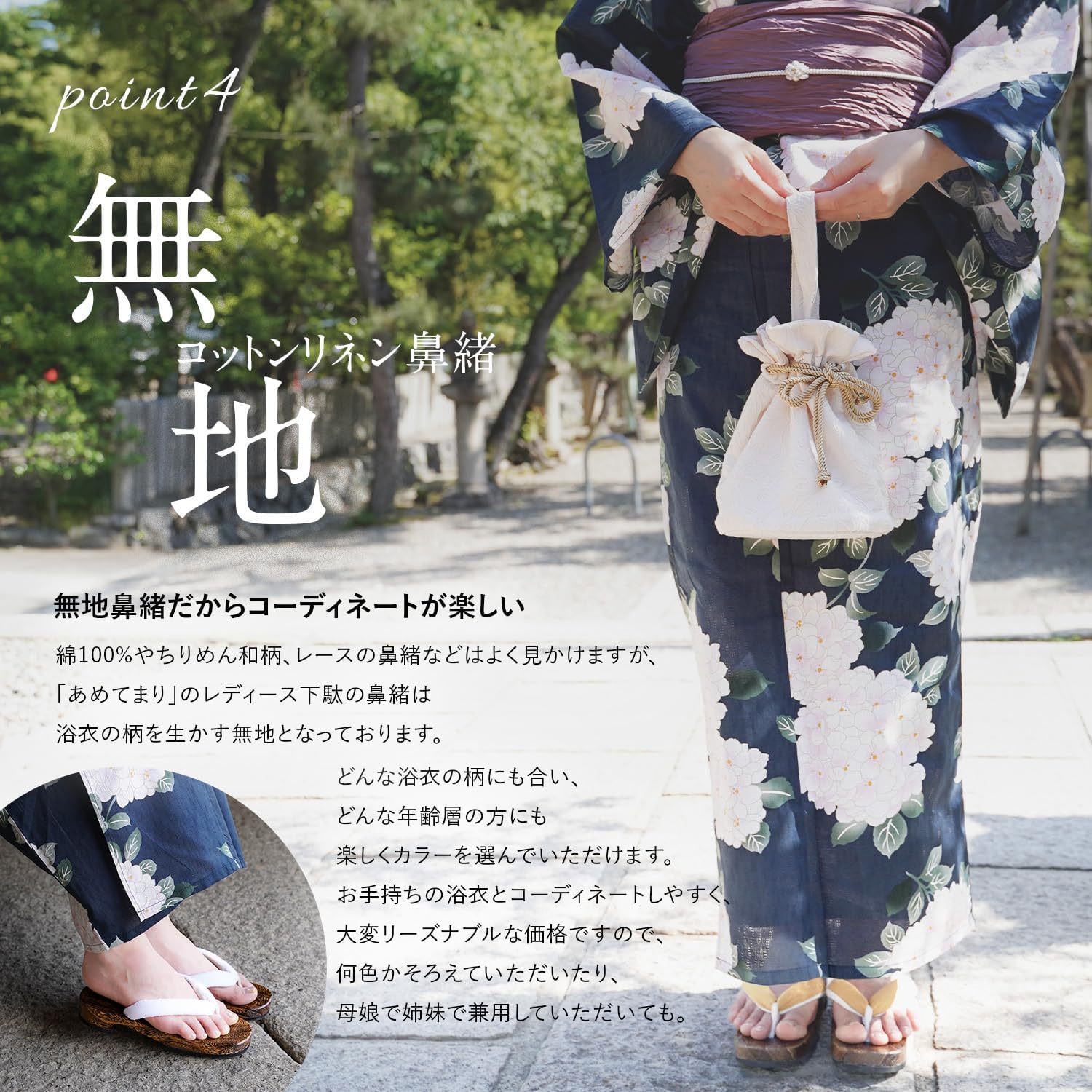 浴衣や夏着物にはもちろん、デニムなどに合わせて普段履きにも。