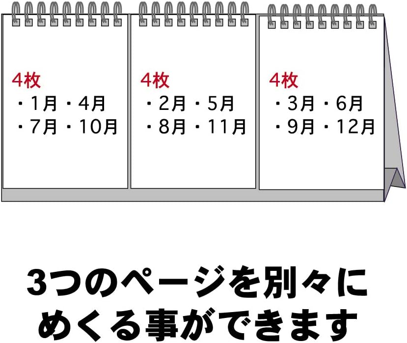【仕様】カレンダー枚数12枚(3P各4枚)・リング留め ※3つのページを別々にめくる事ができます