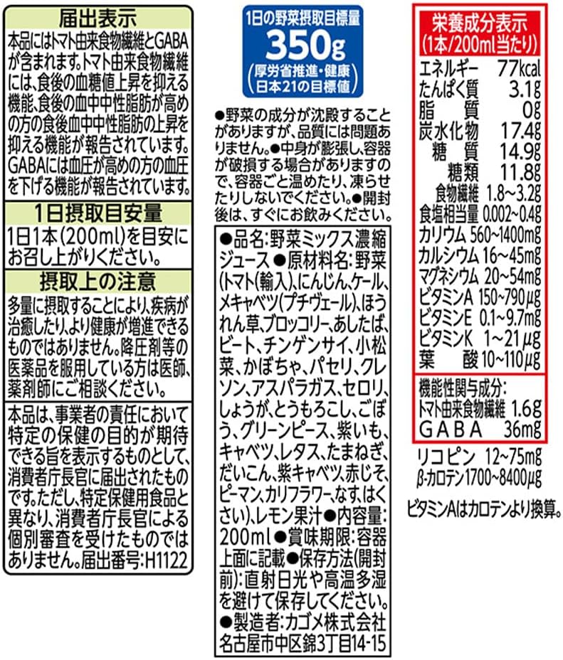 カゴメ 野菜一日これ一本トリプルケア200mlは、野菜一日これ一本トリプルケアは機能性表示食品です。本品にはトマト由来食物繊維とGABAが含まれます。トマト由来食物繊維には、食後の血糖値上昇を抑える機能、食後中性脂肪が高めの方の中性脂肪の上昇を抑える機能が報告されています。GABAには血圧が高めの方の血圧を下げる機能が報告されています。血糖値や中性脂肪、血圧が気になる方におすすめです。1日1本(200ml)を目安にお召し上がりください。