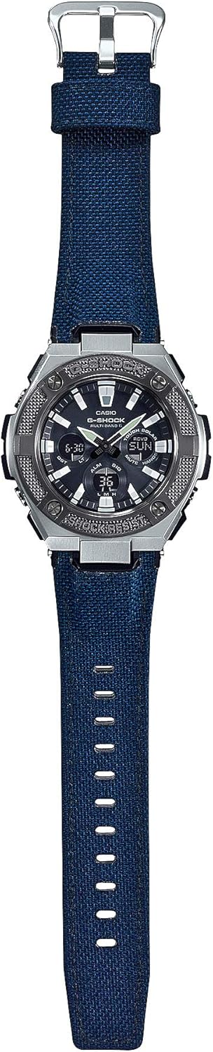 タフネスを追求し進化を続けるG-SHOCKのG-STEELからミリタリーデザインをテーマにしたモデルです。今モデルは、先進の機能を搭載したミッドサイズのGST-W330をベースに、ベゼルはステンレス素材に鍛造によるローレット加工を施し武骨でタフなデザインに仕上げました。またGST-W330ACにはブラックIPまたはグレーIPを施し、よりベゼルの素材感を強調しました。GST-W330Dのバンドにはステンレスバンドを、GST-W330ACには耐摩耗性に優れた合皮「タフレザー」と機能性の高いワークウェアやミリタリー用品などに用いられ、通常のナイロン生地よりも強度に優れる「CORDURAファブリック」を組み合わせたバンドを採用。耐衝撃性能を確保しつつもミリタリーテイストのデザインに仕上げました。多種多様なベゼルやバンドデザインを可能にするG-STEELならではの機能美を放ち、様々なカジュアルファッションシーンで活躍します。機能面では世界6局の標準電波に対応するマルチバンド6や針退避機能などの実用性に加え、文字板にはネオンイルミネーター、液晶にはホワイトのバックライトを採用し、暗所での視認性を向上させました。新採用のバンドやベゼルにより、更なるデザインの幅を広げ進化を遂げたG-STEELです。(こちらはGST-W330ACになります。)