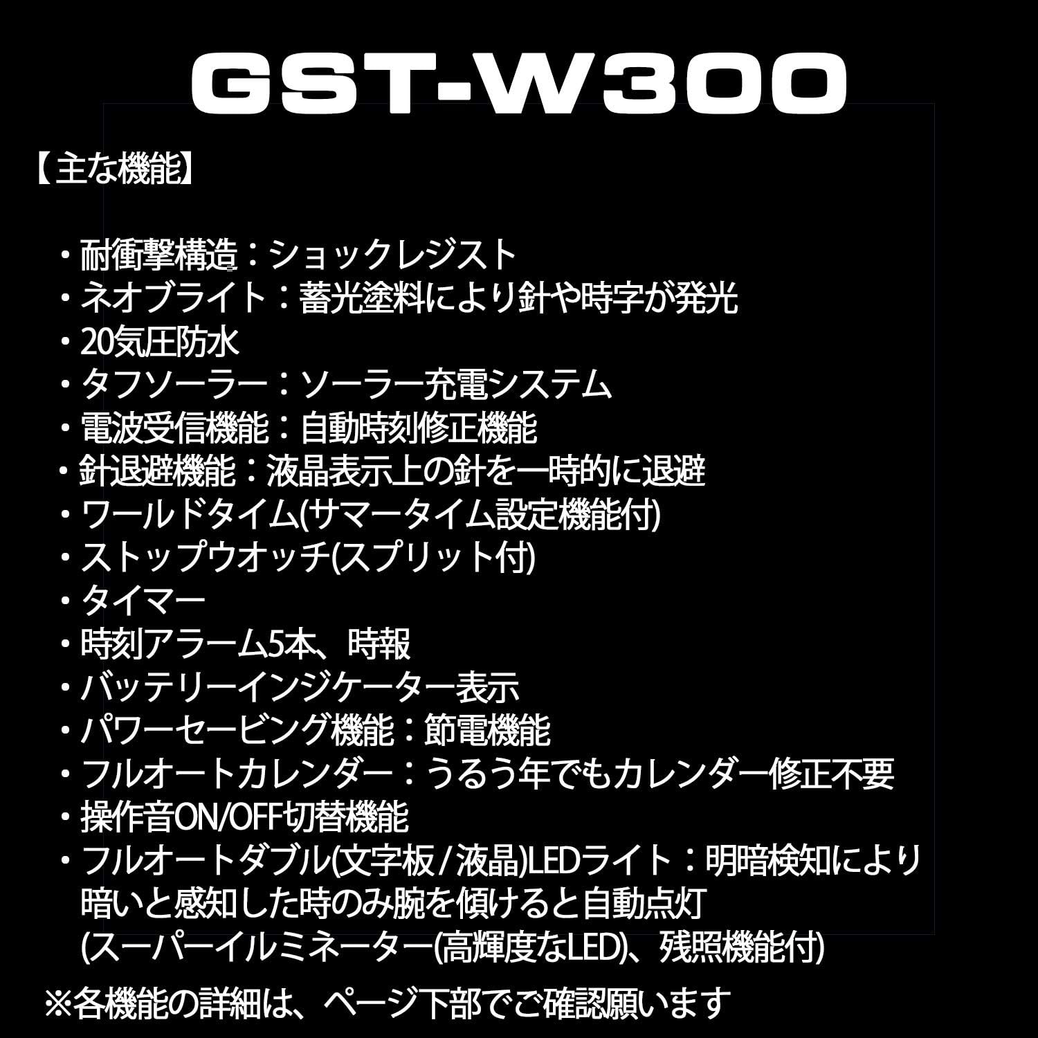 ●ダブルLEDライト:文字板用LEDライト(フルオートライト、ネオンイルミネーター、残照機能、残照時間切替(1. 5秒/3秒)付き)、LCD 部用LEDバックライト(フルオートライト、スーパーイルミネーター、残照機能、残照時間切替(1.5秒/3秒)付き)