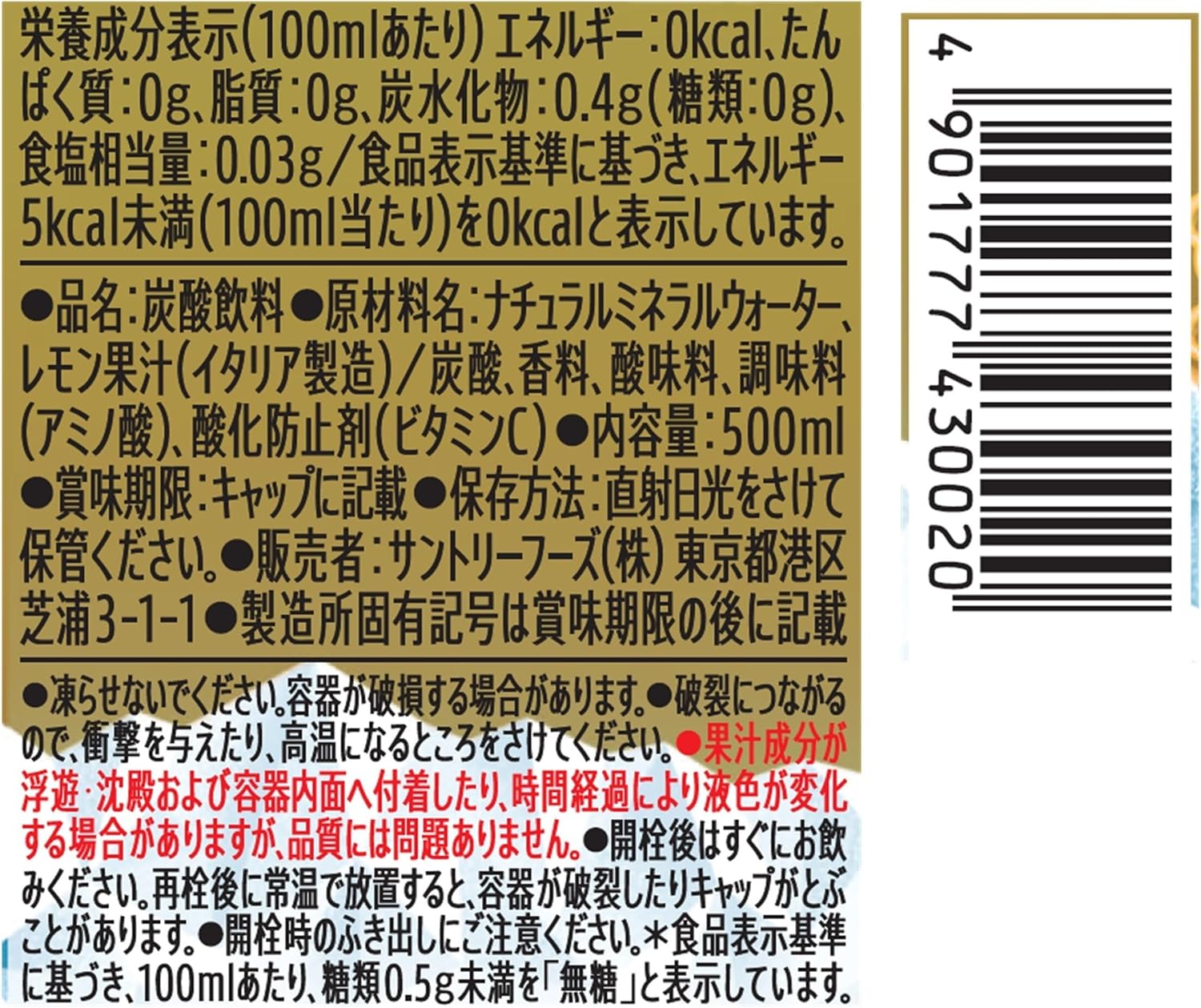 原材料:ナチュラルミネラルウォーター、レモン果汁(イタリア製造)/炭酸、香料、酸味料、調味料(アミノ酸)、酸化防止剤(ビタミンC)