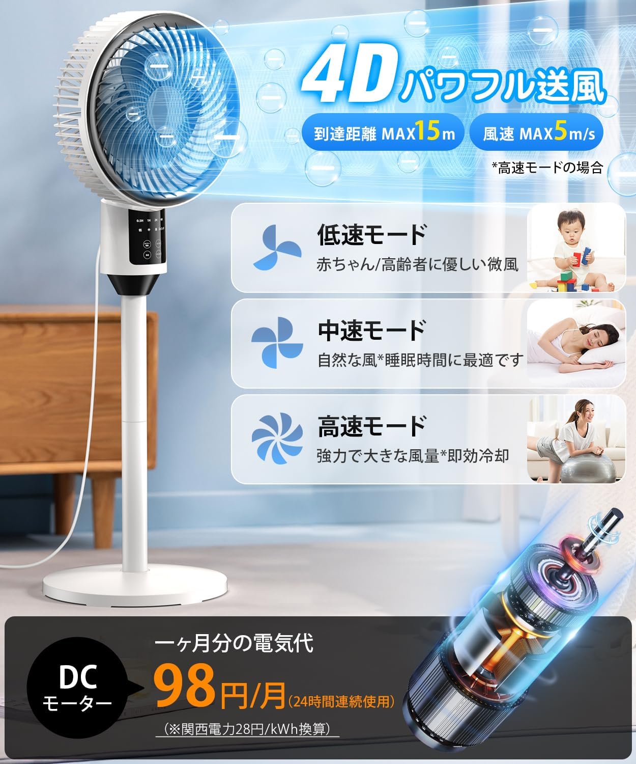 🏕️3段階風量+DCモーターで静音・省エネ・長寿命🏕️ サーキュレーター dcモーター 搭載で弱/中/強の3段階風量切替可能。弱風モードは25dB(図書館レベルの静音性)で高齢者や乳幼児などにも適しています;中風モードでは均等に送風し、仕事の集中力や睡眠の質に影響を与えない。強風モードは5m先まで届くパワフル送風で20畳スペースを効率循環。消費電力はわずか 45W で、伝統的な交流モーターと比べてエネルギー消費が 67% 削減されます。7.5時間のタイマー機能(0.5時間刻みで調整可能)を備え、予めオフタイマーを設定でき、一晩中風を当てることによる不快感を避けます。消費電力の実測値は、強モードで24時間連続運転した場合、わずか1.08kW·hで、1日平均8時間使用した場合の年間電気代は3,680円(28円/kW·hの場合)と、高効率給気と持続可能な省エネのバランスがとれている。