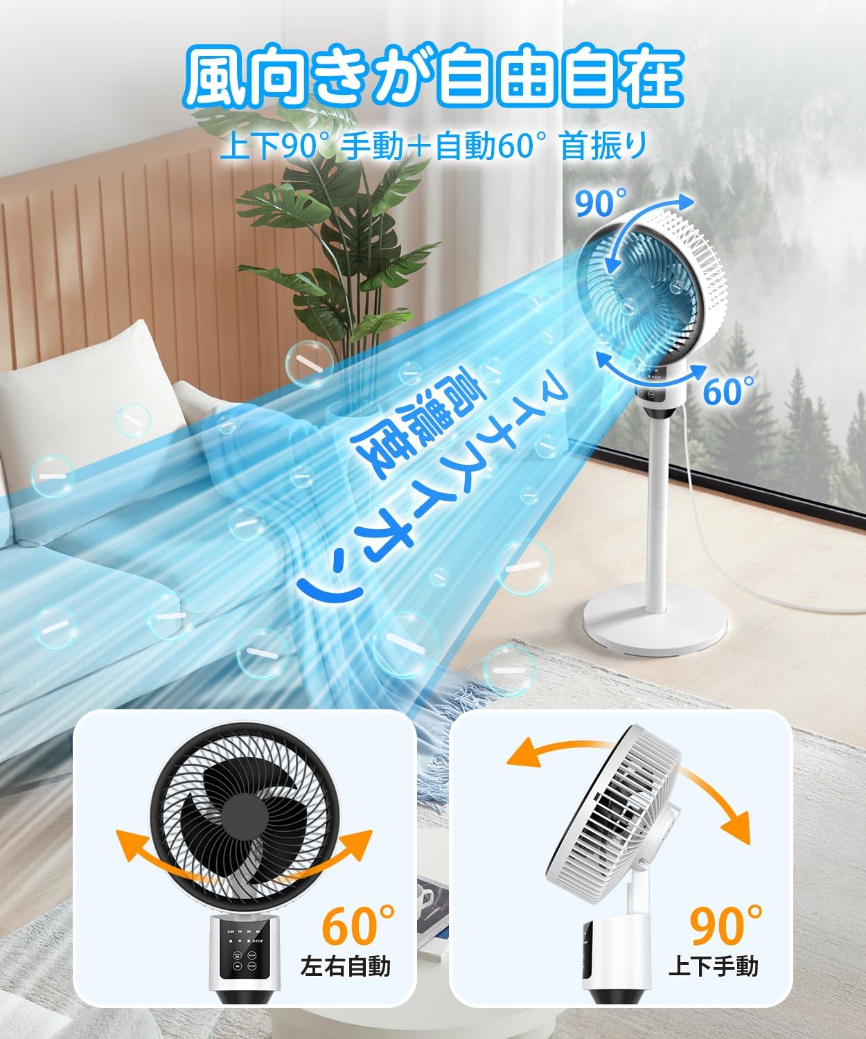 🛫タッチパネル&リモコン操作で4D立体気流を実現🛫 手動で上下90°の給気角度を調整でき、実際のニーズに応じて給気角度を自由に調整できます。タッチパネルまたはリモコンを使用すると、ワンキーで左右60°の広角自動掃気を切り替えることができ、冷風を直接吹き付けることによる頭痛、鼻づまりなどの不快感を軽減します。高濃度マイナスイオン※1cm³あたり300万個を放出。立体4D気流で温風と冷風の急速循環を促進し、5分で家全体の温度を均一化、循環効率は50%アップ。