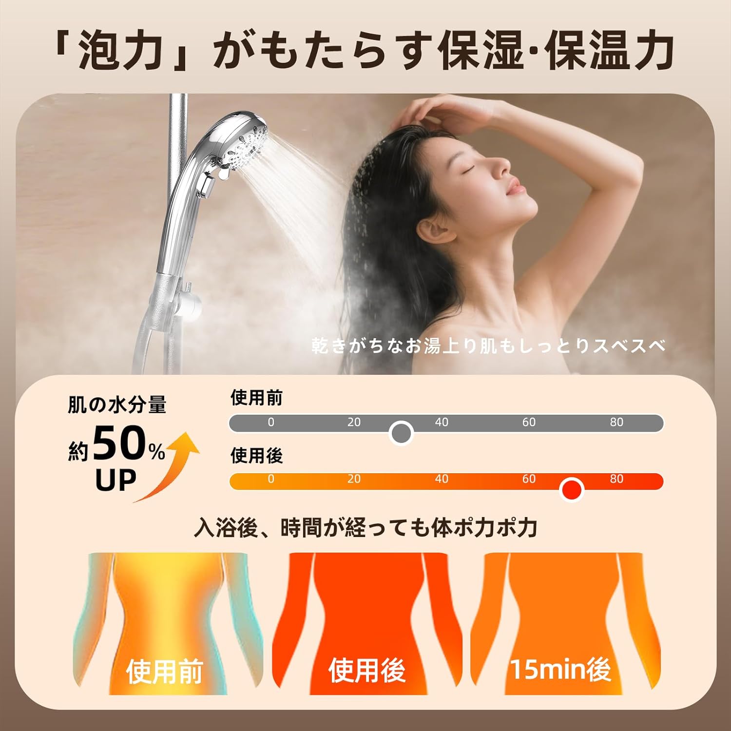 【豊かな7種類出水モード&塩素除去機能】「塩素除去」・「節水」・「保温・保湿」などの機能が付いているシャワーヘッドが新登場!7種類の出水モードを搭載しているマイクロナノバブルシャワーヘッドは、シャワータイムをまるでSPAのような体験を提供できます。塩素除去フィルター付きの『塩素除去』機能は敏感な肌質の方にも安心、肌・髪に優しい設計を採用します。