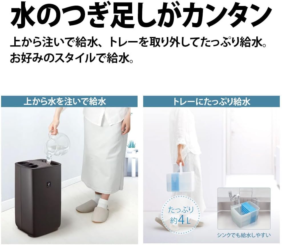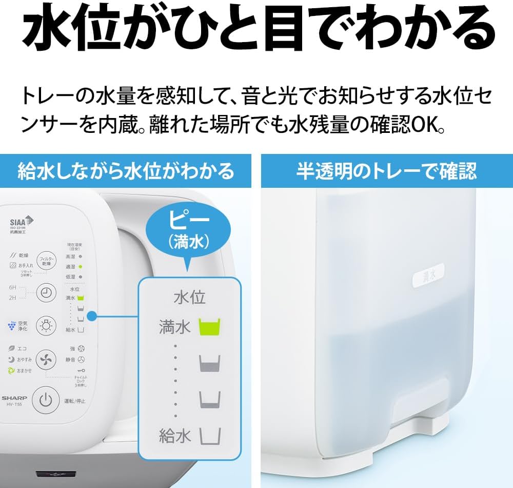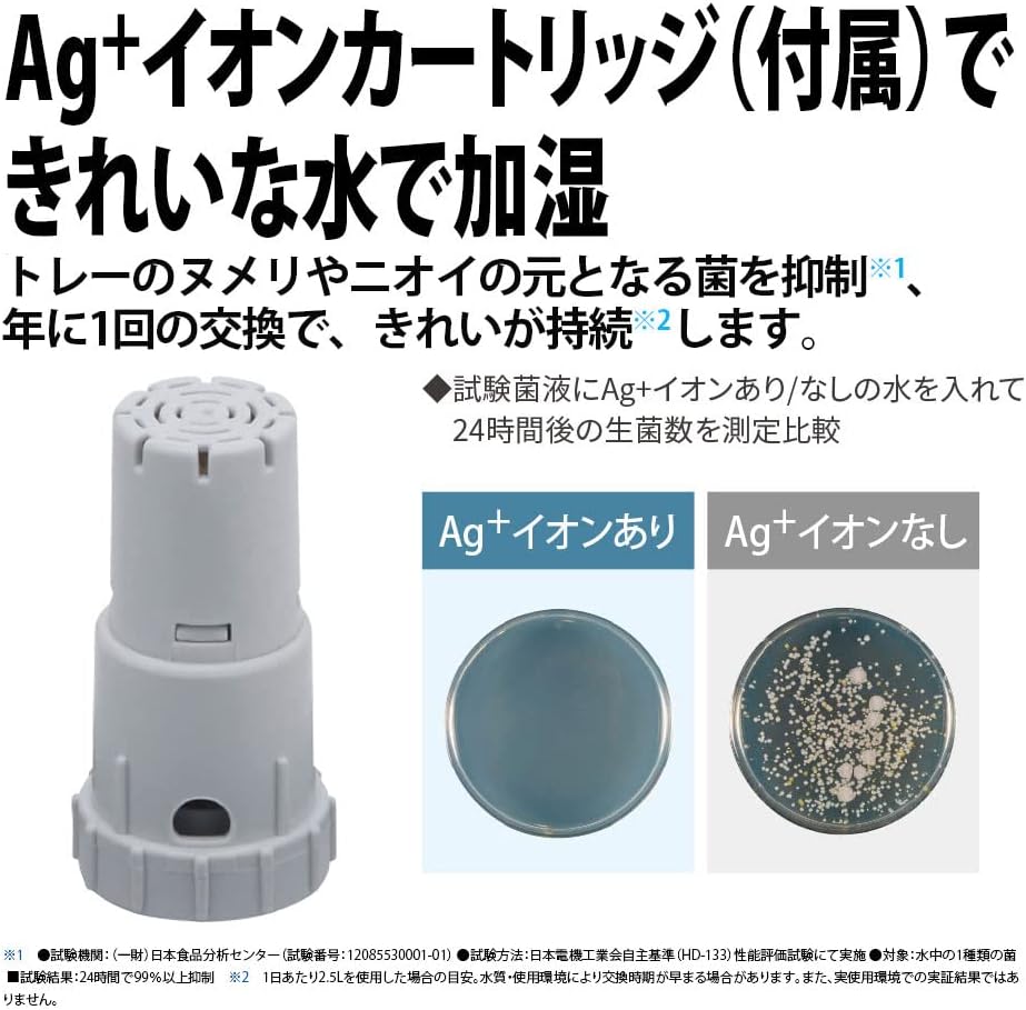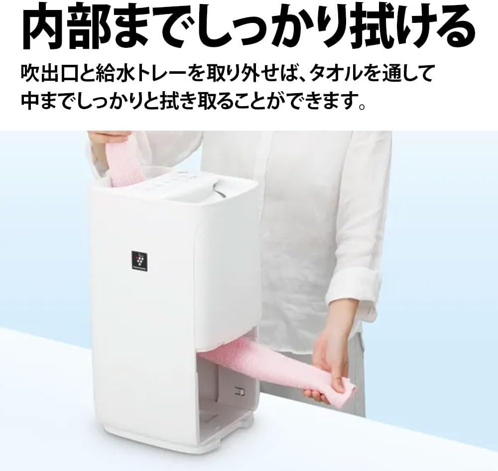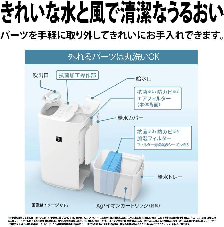 給水もお手入れもカンタン、清潔仕様のレギュラータイプ。ハイブリッド式。水のつぎ足しがカンタン:使い慣れた持ちやすい容器で上から注いで給水、トレーを取り外してたっぷり給水。お子さまからご高齢者まで、使いやすいお好みのスタイルで給水できます。水位がひと目でわかる:操作部の水位表示ランプで、水を注ぎながら水位を確認できます。満水になると音でお知らせします。さらにトレーが半透明なため、離れた場所からでも水の残量がすぐに確認できます。きれいな水と風で清潔なうるおい:プラズマクラスターならではのきれいな風で、清潔なうるおいをお届けします。プラズマクラスター7000搭載:シャープ独自の空気清浄技術、プラズマクラスター7000を搭載しています。「プラズマクラスター」技術で実証している主な効果:浮遊カビ菌を除菌、浮遊ウイルスの作用を抑える、染みついたタバコのニオイを消臭、静電気を抑える。お手入れが簡単な清潔設計:水と風の通り道となるパーツを手軽に取り外して、きれいにお手入れできます。操作部はSIAA抗菌加工の清潔仕様:ボタン操作などで手や指がよくふれる操作部を抗菌加工。清潔を保ちながら、安心の使いごこちを届けます。内部までしっかり拭ける:吹出口と給水トレーを取り外せば、タオルを通して中までしっかりと拭き取ることができます。フィルター乾燥機能で収納時も清潔:専用ボタンを押すと、約60分で加湿フィルターを自動で温風乾燥。シーズンオフには、清潔な状態で保管できます。Ag+イオンカートリッジできれいな水で加湿:給水トレーの中に取り付けて使う、付属のAg+イオンカートリッジ。トレーのヌメリやニオイの元となる水中の菌を抑制し、1年に1回の目安で交換することで、きれいが持続します。(交換用イオンカートリッジは別売です)コンパクト設計:幅約27cmで、ほぼA4サイズの面積で設置が可能。縦型スリムな省スペース設計だから、寝室などのパーソナルスペースにもおすすめです。エコモード:ヒーターレスで省エネ加湿できる、エコモードを搭載しています。温度・湿度Wセンサー:室温に合わせて、55~65%の快適な湿度に制御できます。チャイルドロック:お子さまのいたずらや誤操作を防止します。信頼のS-JET認証取得:第三者認証機関によって製品試験及び工場の品質管理の調査が行われている証です。