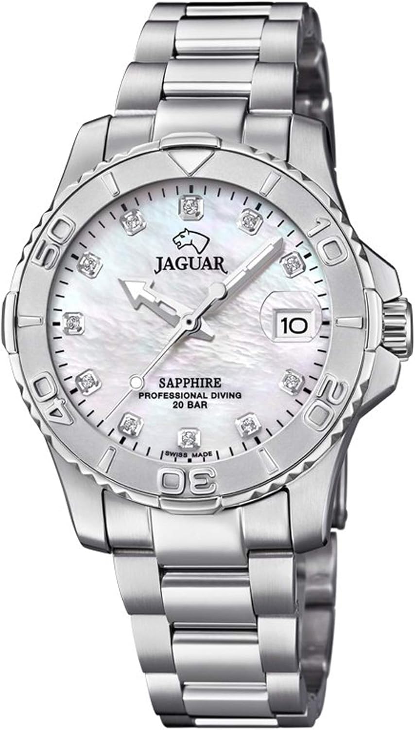 Jaguar 女性用 時計. シルバー スチール ケース と シルバー ステンレス鋼 ストラップ. ホワイト ダイヤル. クオーツ 動作. 両開きワンプッシュタイプ 留め金. 防水加工 200 メートル.