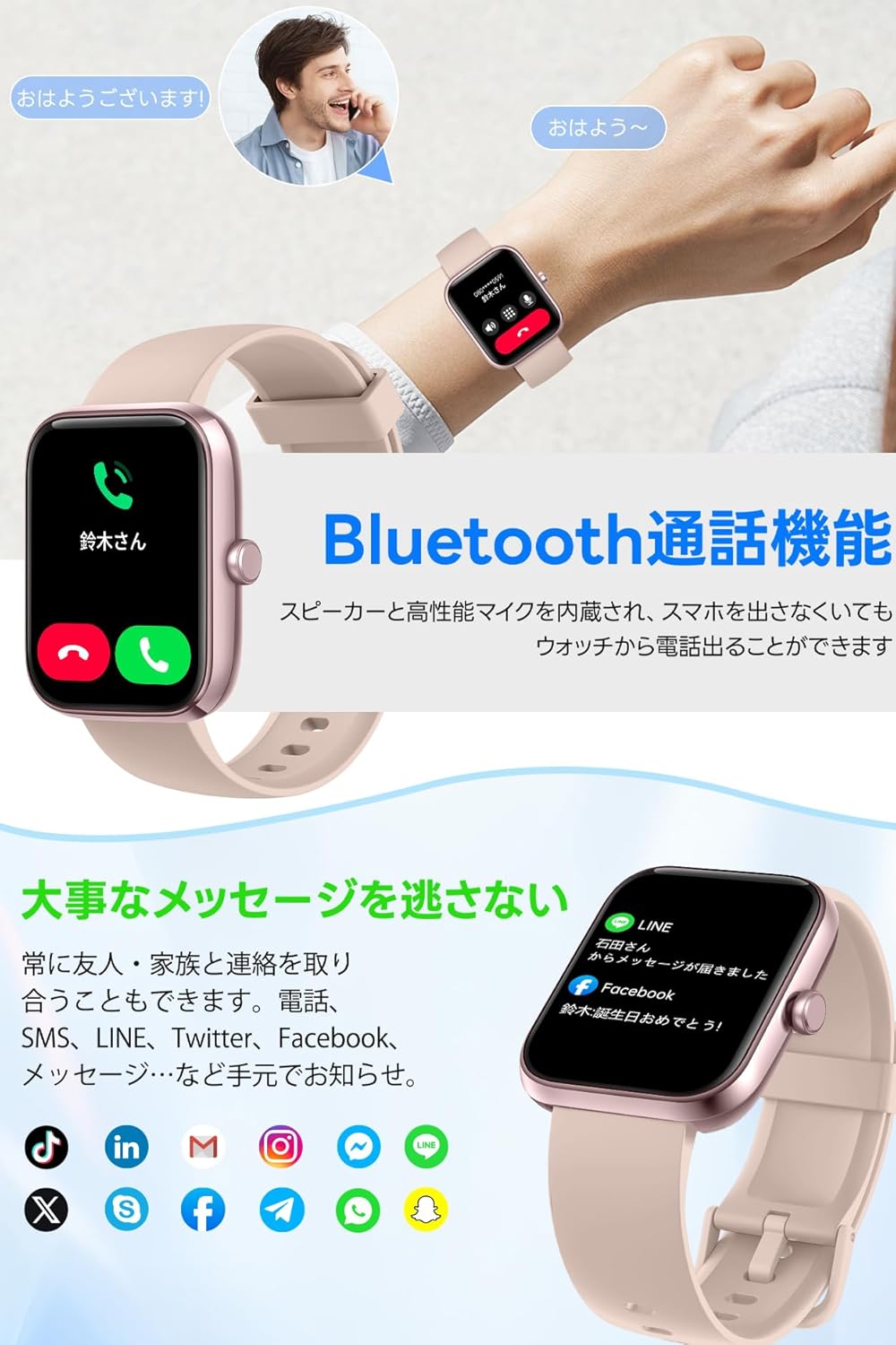 ✅【Bluetooth 5.3通話&メッセージ通知をもっと快適に】スマートウォッチは高性能マイクとスピーカーを内蔵しており、Bluetooth 5.3を介してスマートフォンと接続することで、通話の受信・発信・履歴確認・連絡先の保存がすべてウォッチ上で可能になります。わざわざスマホを取り出す必要がなく、運転中や作業中でもスムーズに通話できます。また、LINE、Facebook、Instagram、X(旧Twitter)などの通知も即座に受信でき、重要なメッセージを見逃しません。iOSとAndroid両方の端末に対応しており、日常のコミュニケーションをより便利にサポートします。