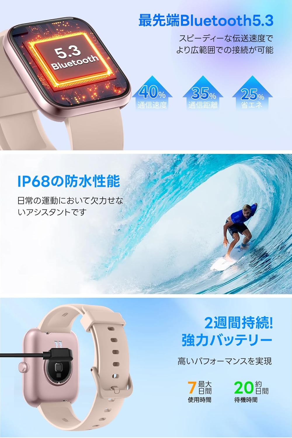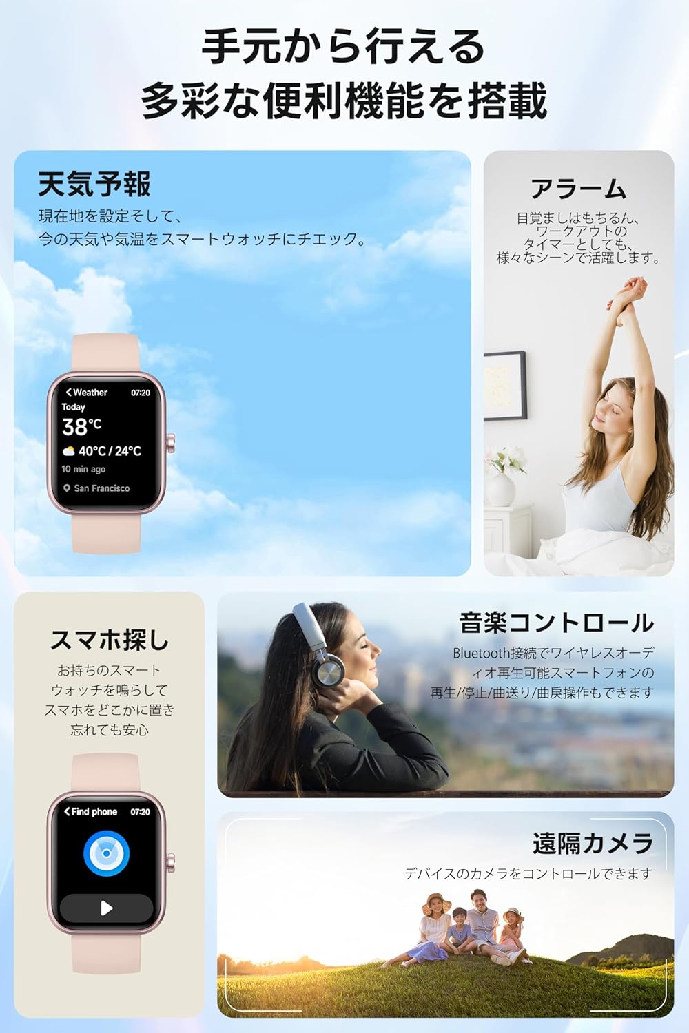 お客様はこのスマートウォッチについて、以下のように評価しています: 使いやすさが高く評価されており、設定が簡単で操作も簡単だと好評です。また、画面が大きく見やすく、機能が豊富で、必要な機能が一通り揃っているとの声があります。 また、コストパフォーマンスが良く、コスパが良いと感じているようです。デザイン面でも可愛らしく、色味も気に入っています。