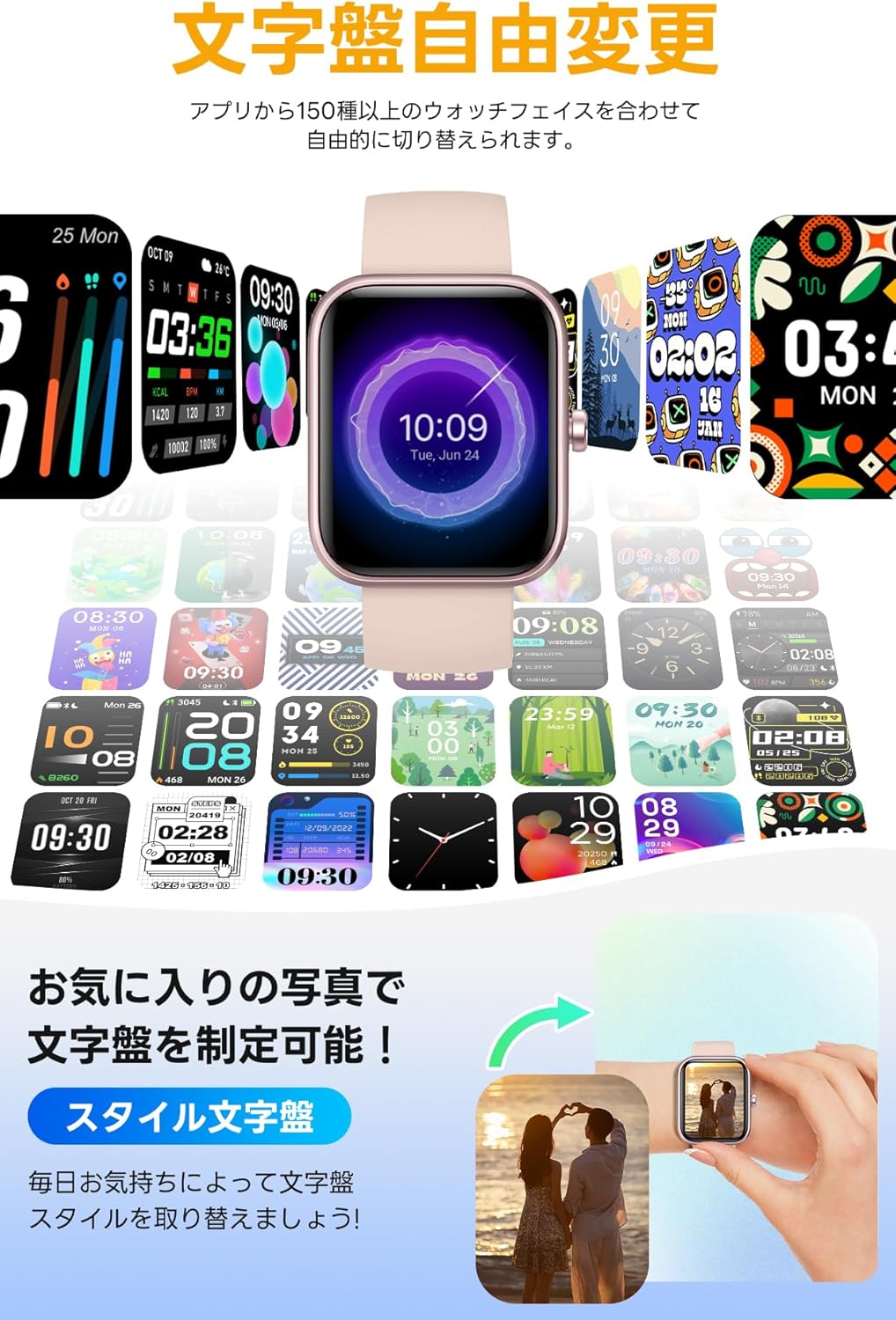 ✅【1.83インチ大画面&DIY文字盤】スマートウォッチは1.83インチの高精細ディスプレイを採用し、明るく見やすい画面で、通知や文字が一目で確認できます。スマートフォンのような滑らかなタッチ操作で使いやすさも抜群です。また、150種類以上のスタイリッシュな文字盤デザインに加え、スマートフォンからお気に入りの写真(ペット、家族、風景など)を取り込んでオリジナル文字盤を作ることができます。日替わりで気分に合わせて画面をカスタマイズし、毎日に彩りをプラス。