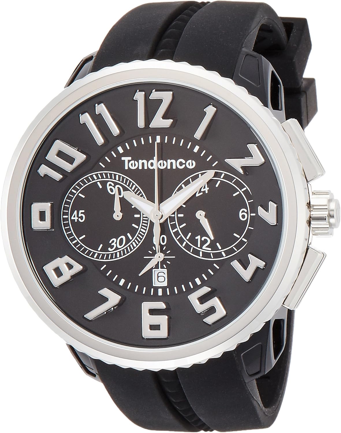 モデル紹介:テンデンスの代名詞モデルともいえるガリバーシリーズの「ガリバーラウンドクロノ」。フェイス幅50mmものビッグフェイスが最大の特徴で、圧倒的なインパクトがテンデンスの世界観を象徴しています。美しい光沢を施されたシルバーのベゼルとリューズが高級感を醸し出します。文字盤のインデックスは類を見ない3Dの立体的なデザインで、ビッグフェイスと見事にマッチし腕元で存在感を発揮します。シリコンラバーベルトを採用しているため、アクティブなシーンでも絶妙にフィットし抜群の着け心地。さらにクロノグラフを搭載しスポーツシーンなど実用性も兼ね備えています。深いブラックをベースとしシルバーのケースでスタイリッシュに極めた仕上りは、スポーツシーンのみならず、ビジネスやカジュアルシーンでも活躍するアイテムです。