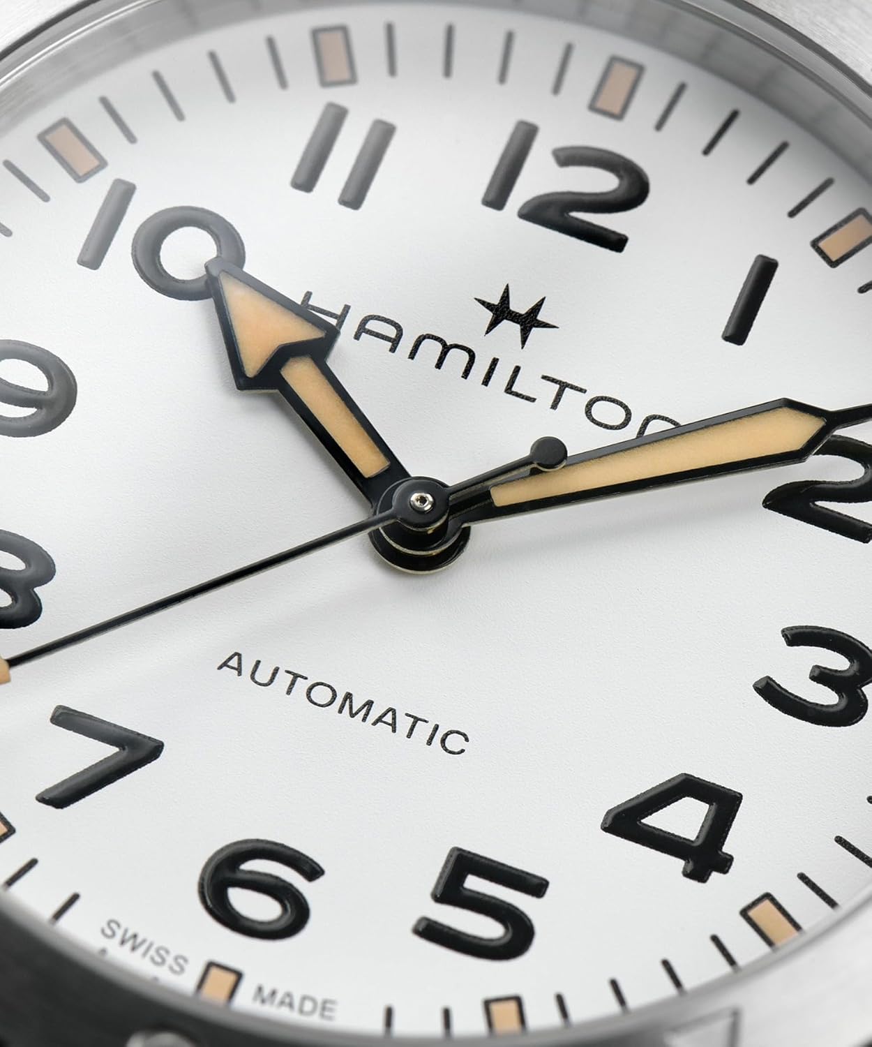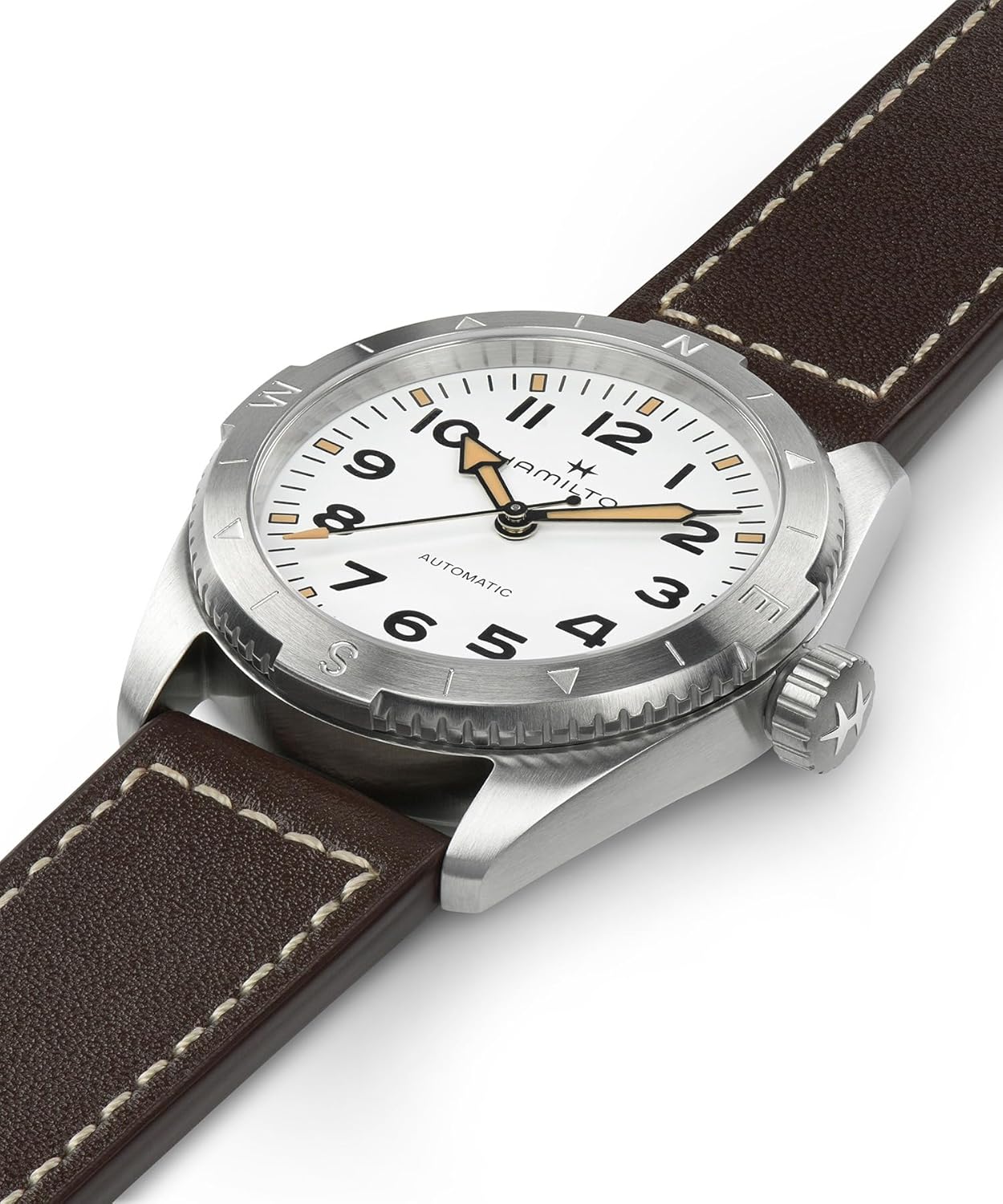 大自然へと誘う「カーキ フィールド エクスペディション」は、どんな場所にも適応するアドベンチャーウォッチ。コンパスのデザインが、太陽が頼りとなる冒険の旅で進むべき道を示してくれます。37mmのステンレススチール製ケースと、ブラウンレザーストラップ、さらにムーブメントを悪天候から守るねじ込み式リューズを備えています。質感のあるホワイトダイヤルに、視認性に優れるスーパールミノバ®加工を施した「カーキ フィールド エクスペディション」は、いかなる状況下でもタフさを発揮します。