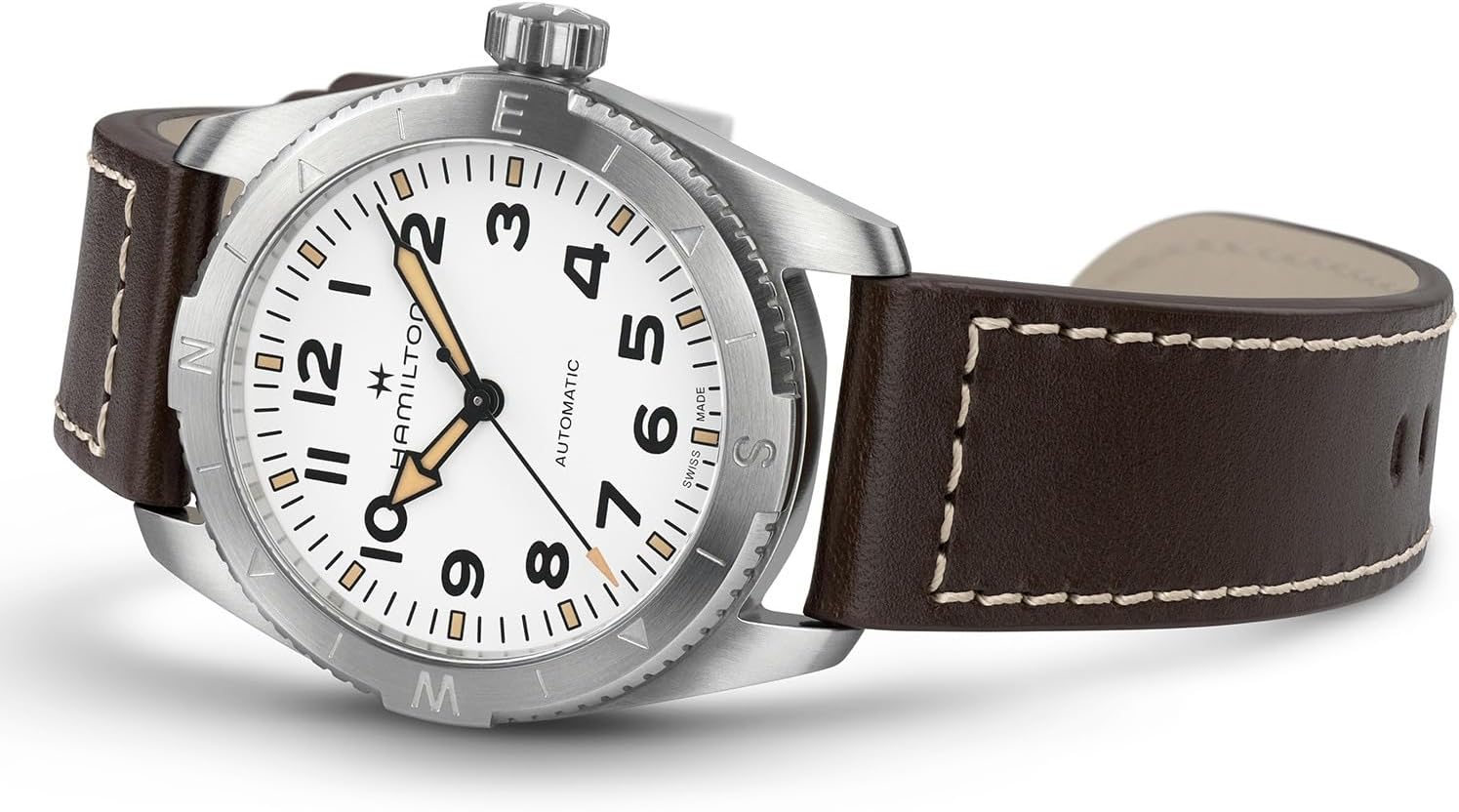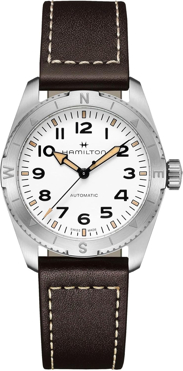 大自然へと誘う「カーキ フィールド エクスペディション」は、どんな場所にも適応するアドベンチャーウォッチ。コンパスのデザインが、太陽が頼りとなる冒険の旅で進むべき道を示してくれます。37mmのステンレススチール製ケースと、ブラウンレザーストラップ、さらにムーブメントを悪天候から守るねじ込み式リューズを備えています。質感のあるホワイトダイヤルに、視認性に優れるスーパールミノバ®加工を施した「カーキ フィールド エクスペディション」は、いかなる状況下でもタフさを発揮します。