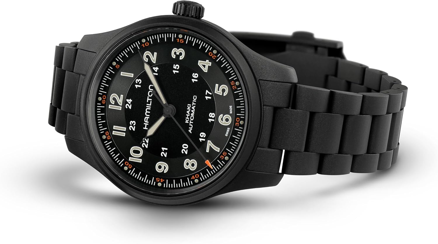 ブラックPVD加工を施したチタニウム製ケースとブレスレットを備えるケース径42mmの「カーキ フィールド チタニウム」は、どんなシーンにもフィットする汎用性の高いタイムピースです。