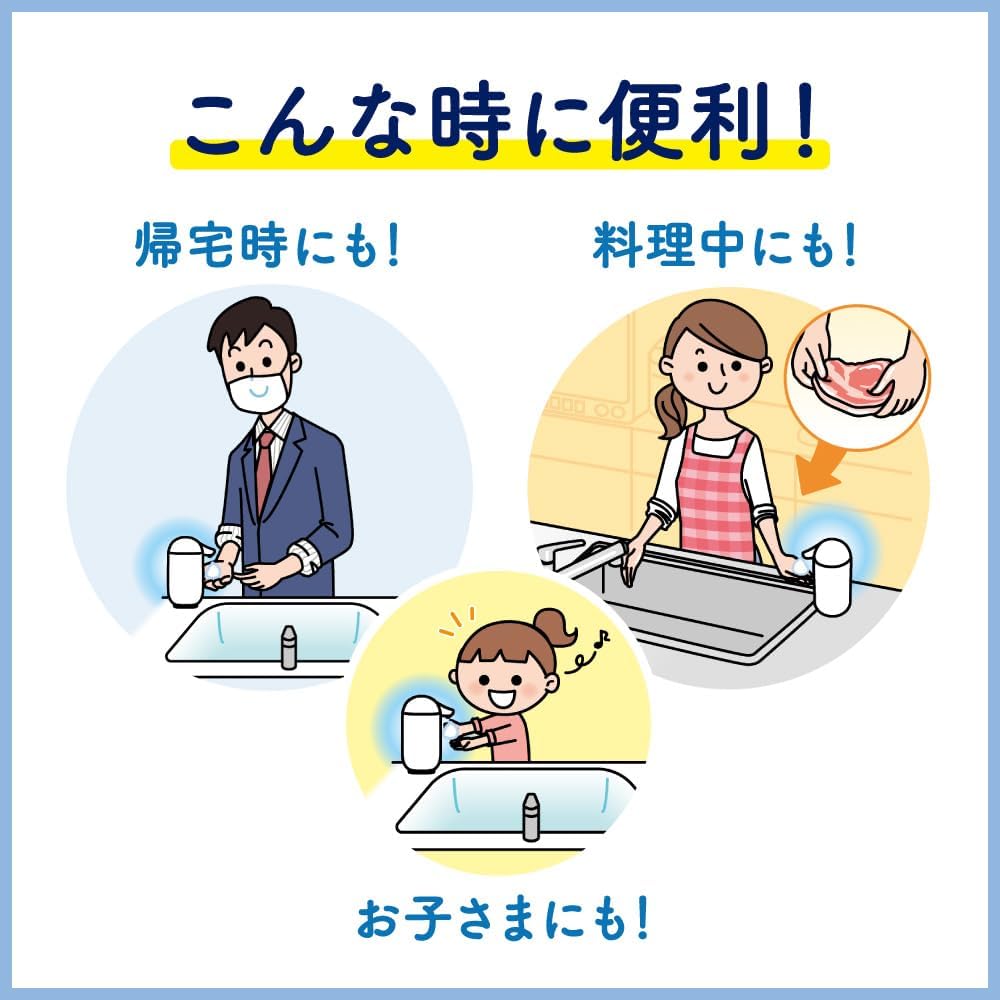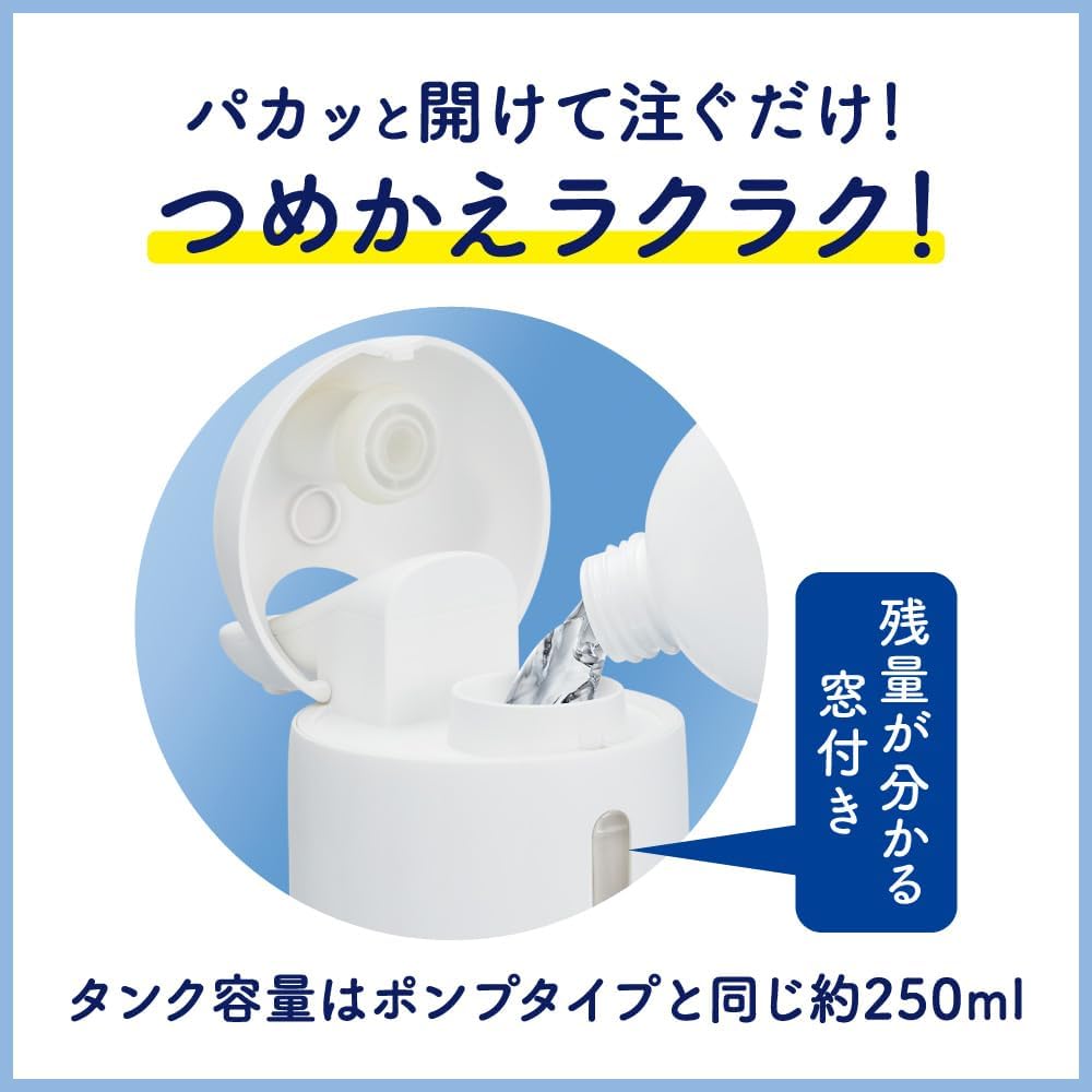 ビオレuの『手肌に優しいなめらか泡』が自動で!! ご使用時にポンプに触れる必要がなく、衛生的。 手をかざすだけで自動に出てくるので、お子様でもカンタンにご使用いただけます。 ~快適に使えるこだわり設計~ ①詰め替え簡単!大きな蓋をパカッと開けて注ぐだけ! ②防水機能つきなので、外も中もまるごと洗浄いただけます! ③底面にシリコーンゴムがついているから、滑りにくく、倒れにくい! ④ビオレu泡ハンドソープポンプとほとんど同サイズのコンパクトな設計 ⑤手をかざしやすい「くちばしノズル」設計