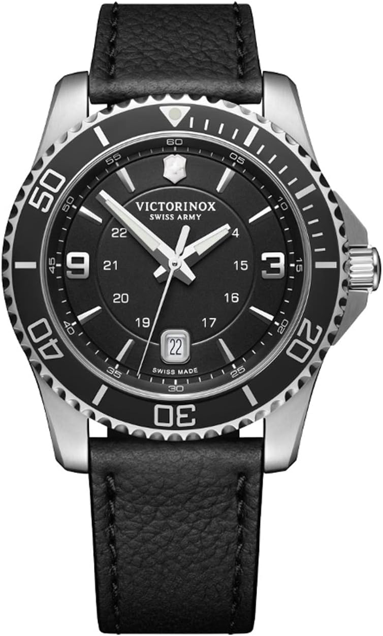 Victorinox 男性用 時計. シルバー スチール ケース と ブラック 天然皮革 ストラップ. ブラック ダイヤル. クオーツ 動作. バックル(尾錠) 留め金. 防水加工 100 メートル.