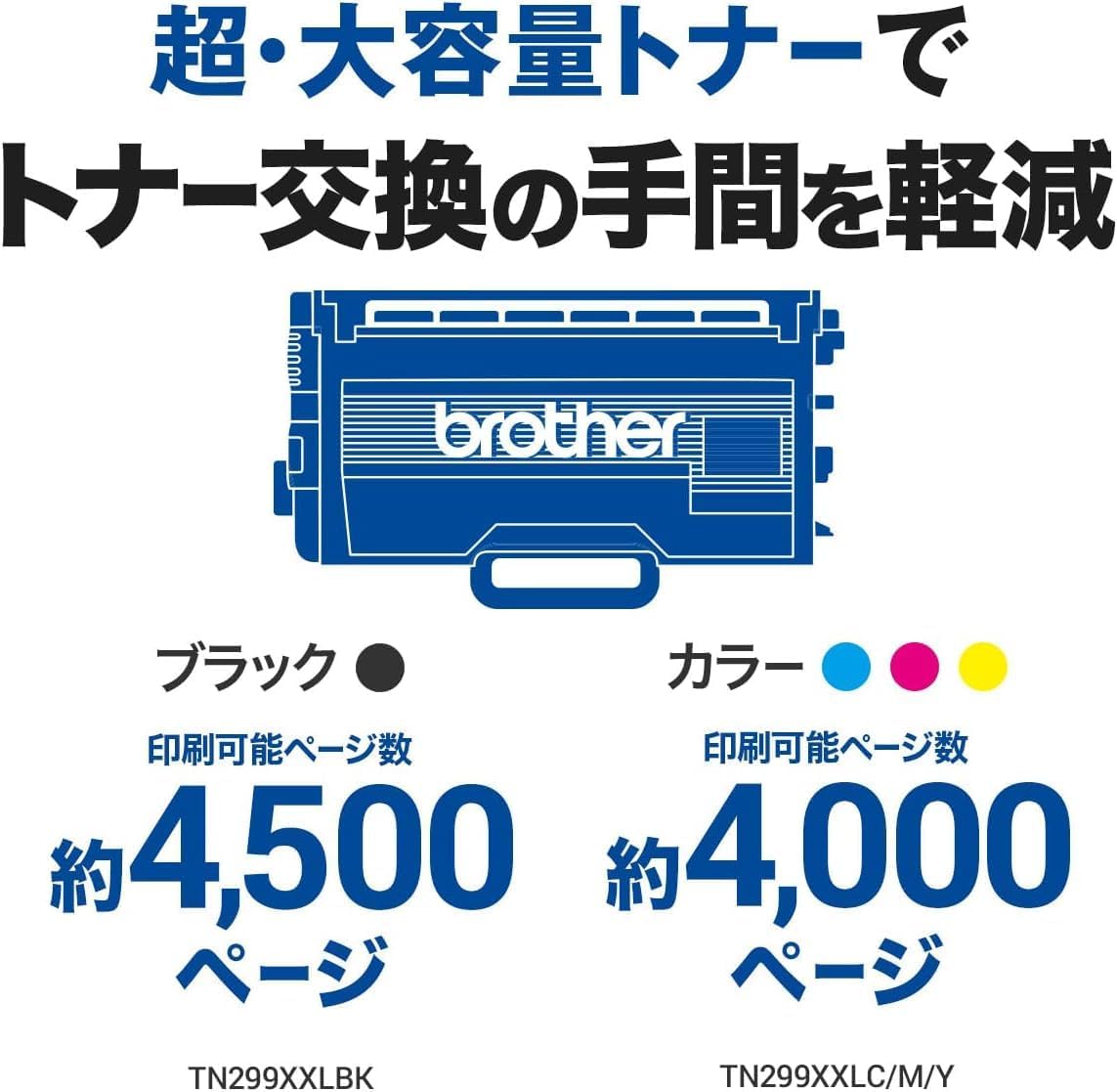 ●モノクロ約4500ページ、カラー約4000ページ印刷可能な超・大容量トナー対応でトナー交換の手間を軽減。トナーカートリッジ廃棄量の削減にもつながります●7年間の高耐久で本体寿命が長く、買替えの手間を軽減●給紙・排紙・トナー交換などの操作を前面から行うことができます。省スペース設計なので本体の場所を取りません●トナーとドラムを別々に交換することができる分離型を採用。両方の部品を無駄なく使いきることができるため、環境負荷も軽減●安定・高速通信であるWi-FiⓇ5GHzにも対応。BluetoothⓇ対応機器や他の電化製品で使用するWi-FiⓇ2.4GHzとの干渉が起きにくく、安定した高速通信が実現●プリント/コピー/スキャン/ファクス対応●カラータッチパネル液晶:3.5型●標準用紙トレイ:1段(最大250枚)●多目的トレイ:最大30枚●ADF(自動原稿送り装置):最大50枚●印刷速度:カラー/モノクロ約30枚/分●自動両面プリント対応●両面同時スキャン対応●搭載メモリ:512MB●インターフェイス:USB/有線LAN/無線LAN●Wi-Fi Direct対応●対応消耗品:TN299C/TN299M/TN299Y/TN299XLC/TN299XLM/TN299XLY/TN299XLBK/TN299XXLC/TN299XXLM/TN299XXLY/TN299XXLBK/DR299CL/DR299CL 4PK/WT229CL/BU229CL