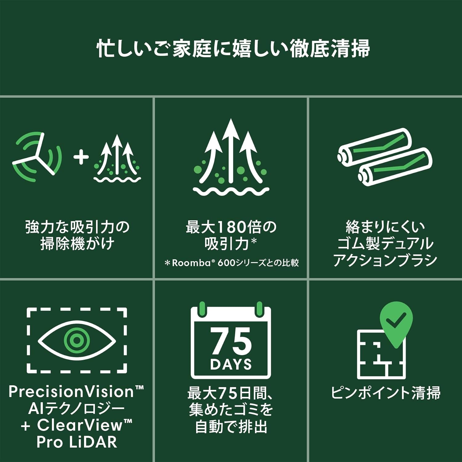 ✅ゴミやホコリを一掃 : 絡まりにくいゴム製デュアルアクションブラシ、エッジクリーニングブラシ、カーペットブースト、そして最大180倍*強力なパワーリフト吸引でペットの毛などもパワフルに除去。 *フル充電でスポット清掃時、国内累計出荷台数トップのRomba 600シリーズとの比較。(2025年2月時点)