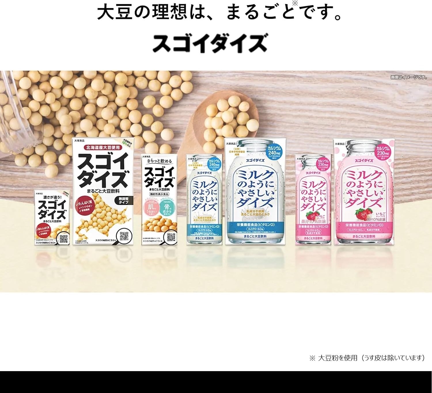 日本で初めて、“おから”の部分まで使用した【まるごと大豆飲料】スゴイダイズ。大豆固形分10%以上。乳成分不使用・コレステロール0mg。大豆本来のうま味を生かした濃厚な味わいです。大豆をまるごと使っているから、大豆たんぱく・大豆イソフラボンはもちろん、食物繊維もとれます。※大豆粉を使用。(うす皮は除いています。)・濃度の高い大豆飲料です。他の大豆食品でアレルギー症状が出ない方でも、まれに発症例がありますので、初めての飲用の場合は少量からの試飲をおすすめします。・特に花粉症やアレルギー体質の方はご注意ください。・大豆成分が沈殿しやすいので、よく振ってからお飲みください。・開封後はすみやかにお飲みください。・温めるときは、別容器に移してください。・温度が低くなりすぎると凍結し、解凍しても元の品質(風味、液状)には戻りません。