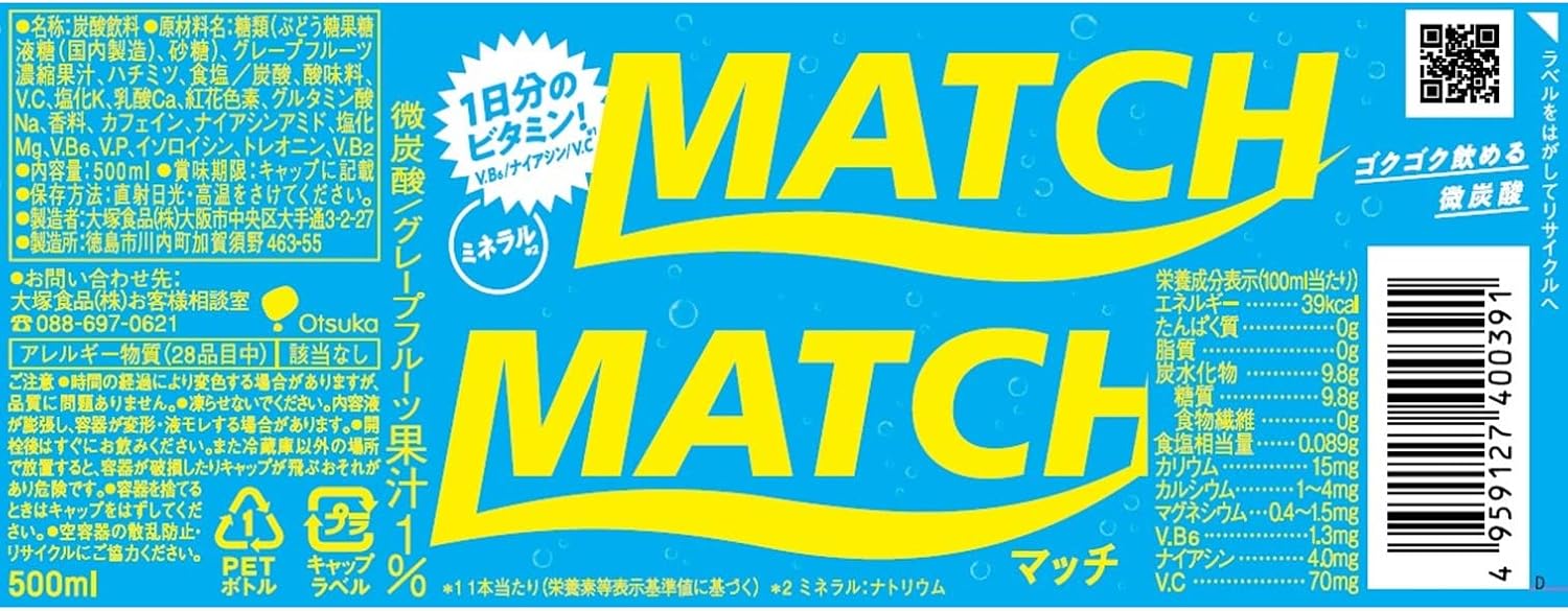大塚食品 MATCH マッチ ペットボトル ビタミン ミネラル 微炭酸 リフレッシュ チャージ ビタミンC 350mg 500ミリリットル (x 24)  Amazonで販売中