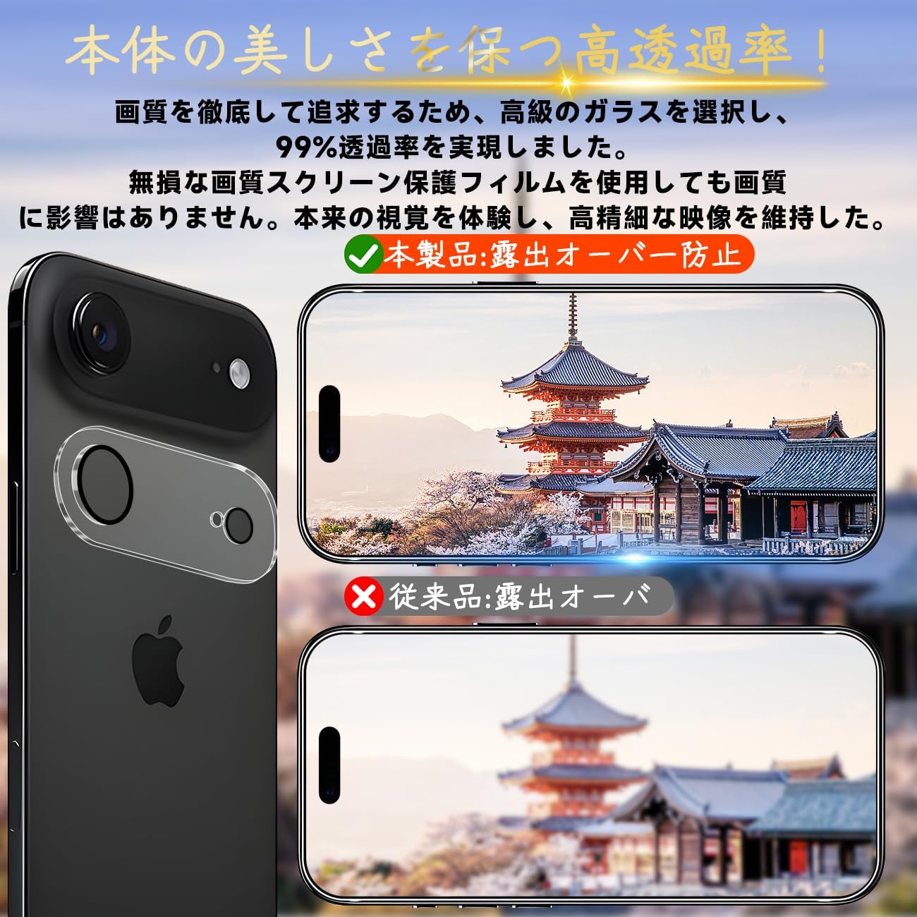 【超高透過率】新しいアップグレードした光学プロジェクション技術を使って、液晶画面保護ガラス フィルムを改良した後、約99.9%高い光線透過率に達し、より高い光透過率と超クリアな視覚体験を実現します。しかも液晶画面の本来の美しさにも影響しません。高精細度でいつでも写真やビデオをきれいに撮影することが可能です。