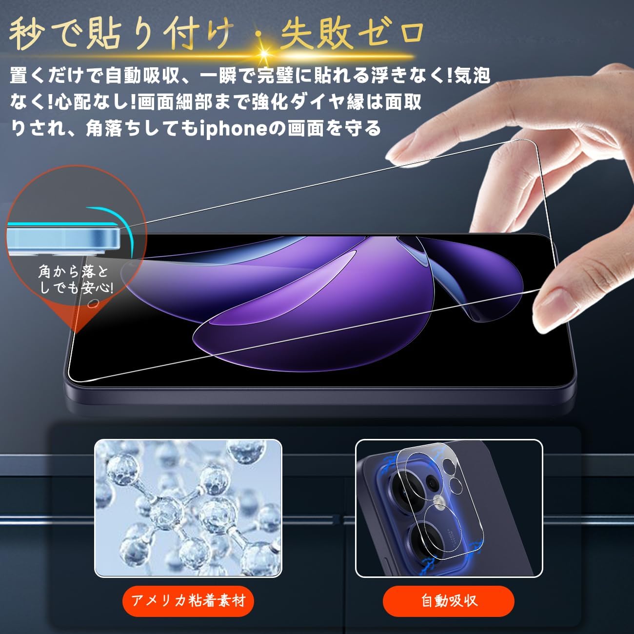とレンズ保護フィルムはすべて旭硝子で作られており、スマホ保護フィルムの中で最高レベルの9H硬度に達しています、4.5時間以上の高温焼入れ処理を行い、スクリーンプロテクターの圧強度は 125mpa に達し、通常 ガラス の 5 倍になりました。しかもスクリーンプロテクターは衝撃を抑えるシリコンコーティングを内蔵しており、万が一ガラスが割れても、ガラスの破片が飛散しません。ハードコーティング技術は、衝撃を最小限に抑えて画面の破損を抑え、すり傷防止や指紋防止もしっかりとスクリーンを保護します。