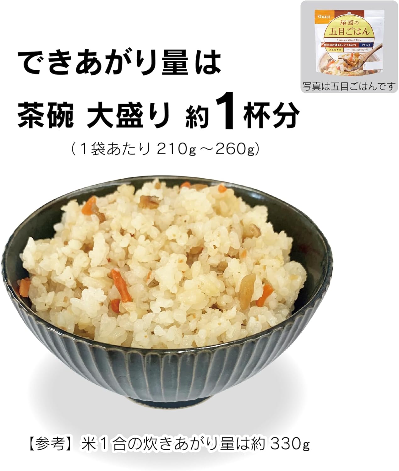 原材料:「アルファ米」シリーズ:白飯、五目ごはん、わかめごはん、田舎ごはん、松茸ごはん、赤飯、山菜おこわ、白がゆ、梅がゆ、ドライカレー、チキンライス、えびピラフ