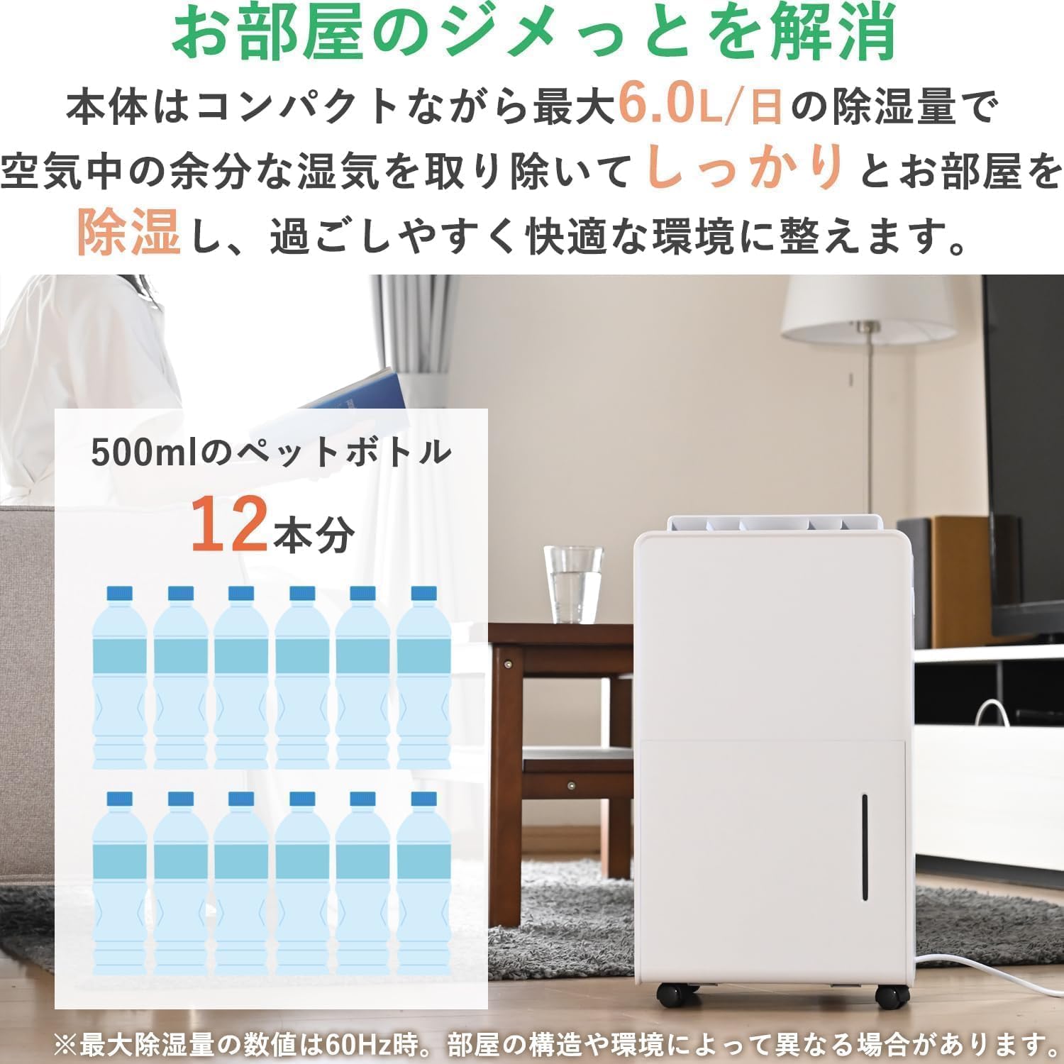 【除湿機能】▪除湿面積の目安:木造6畳/プレハブ10畳/鉄筋13畳(50Hz)、木造7畳/プレハブ11畳/鉄筋14畳(60Hz) ▪タンク容量:約4.5L ▪除湿方法:コンプレッサー式 ▪定格除湿能力:5.0L/日(50Hz)、6.0L/日(60Hz)