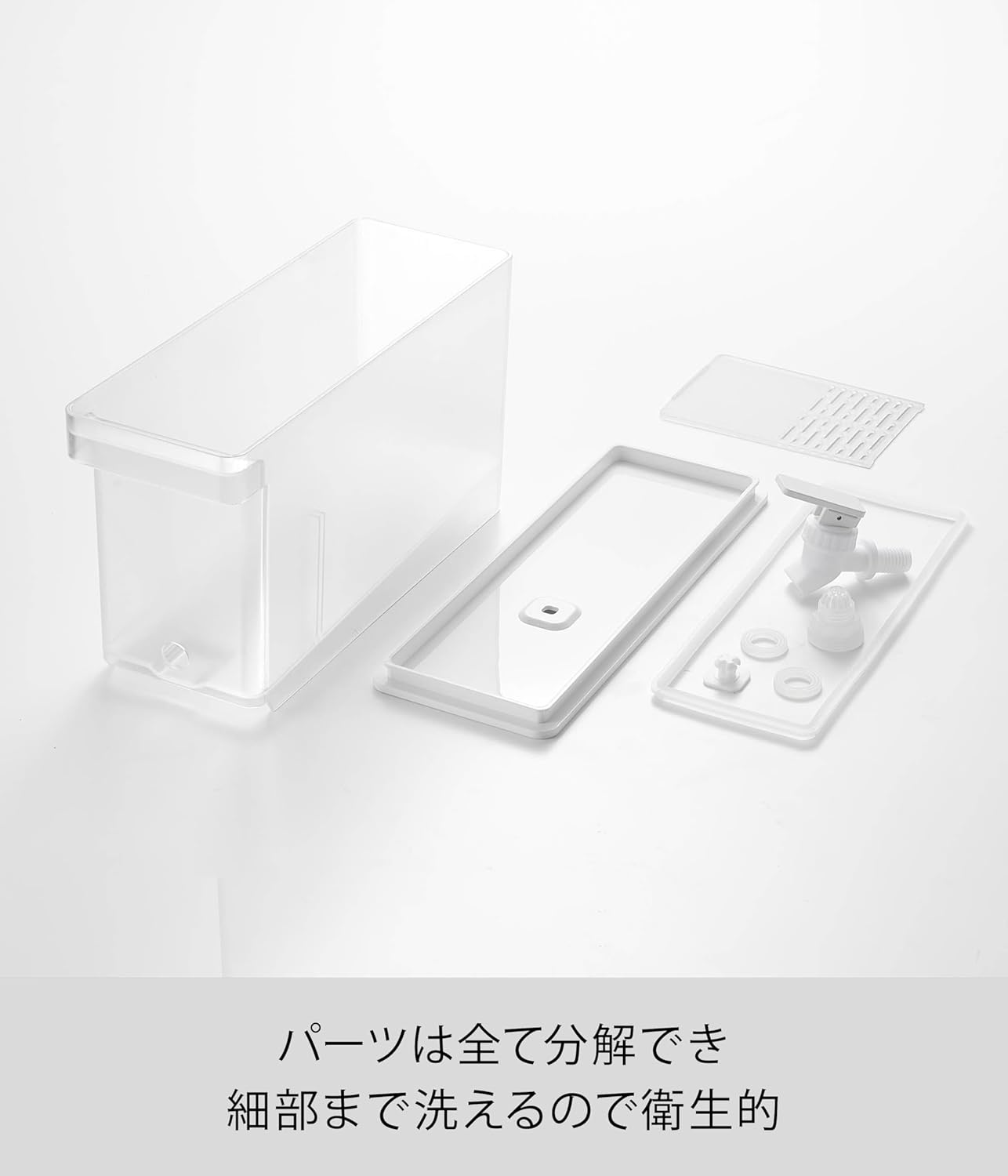 品質表示 容器:メタクリルスチレン 蓋・仕切り板・蛇口・キャップ:ポリプロピレン パッキン・バルブ:シリコーン レバー:ABS樹脂 蛇口バネ:ステンレス鋼