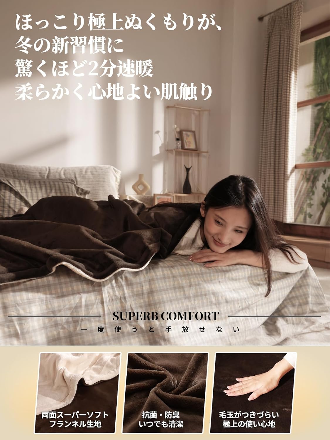 『SNSで話題沸騰・省エネ性能拔群!万人受けする至極の肌触り║体も心もよろこぶ、ひとつ上の電気毛布』高い技術力、優れた省エネ性、洗練されたデザインを兼ね備えた、ふわふわの掛け 電気毛布。 ✓ 最大消費電力120W、低温度段階(2~3)で1時間あたりの電気代わずか約0.62円(1Kwh単価31円で算出)と非常に経済的。無理せず節電!ECOかつHOTな敷き 電気毛布で、心地よい眠りへと誘います。「寒~い!」から「暖か~い!」まであっという間! ✓ 両面楽しめる上質のフランネルで、ふんわりとした生地感は体に優しく馴染み、外の冷気をシャットアウト。素材はもちろん、最終の柔軟仕上げまで徹底的にこだわった、仕上げまで丁寧な技と匠の心意気を。細部にまで宿る縫製の技、繊細なやわらかさと、きめ細かな毛密度を実現、思わず抱きしめたくなるほどのとろ~り触感。品質も美しさも、妥協しない方へ