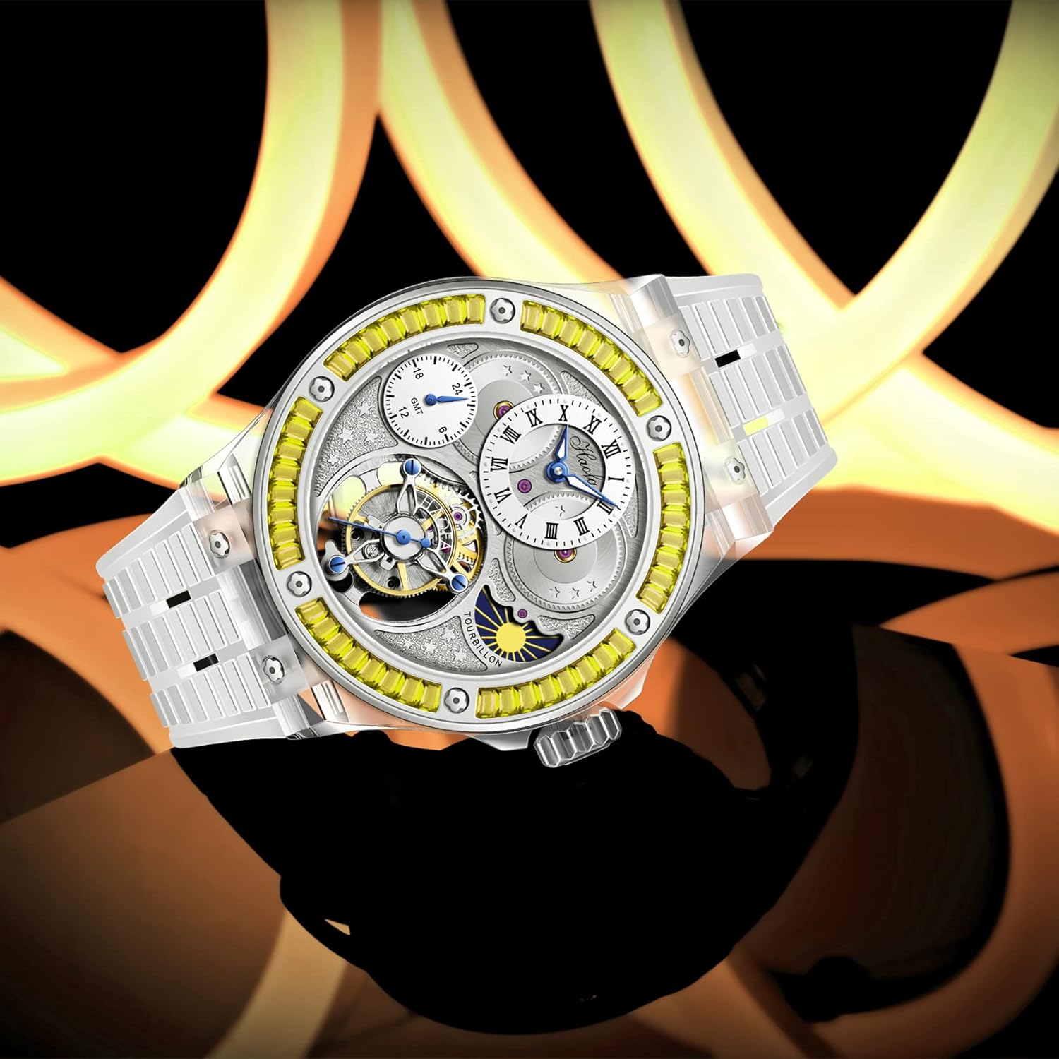 ケースはK9クリスタルガラス製で、光透過率、屈折効果、硬度、質感に優れています。 ムーブメントの絶妙な構造は、時計の文字盤を通して垣間見ることができます。 透明なストラップは、もともとストラップの下に隠されていた肌を表しており、時計のエレガントなシルエットに追加されています。