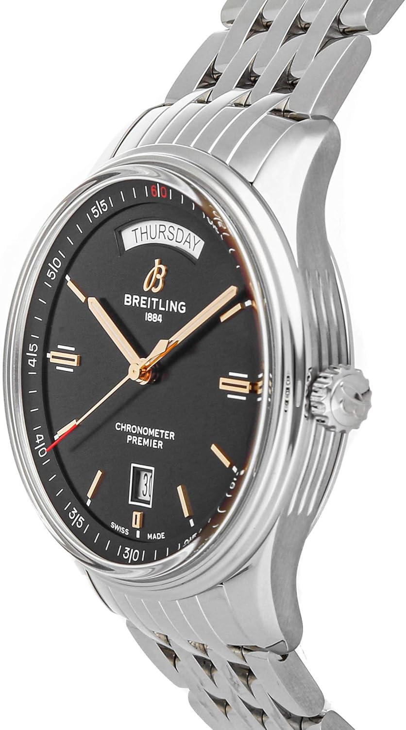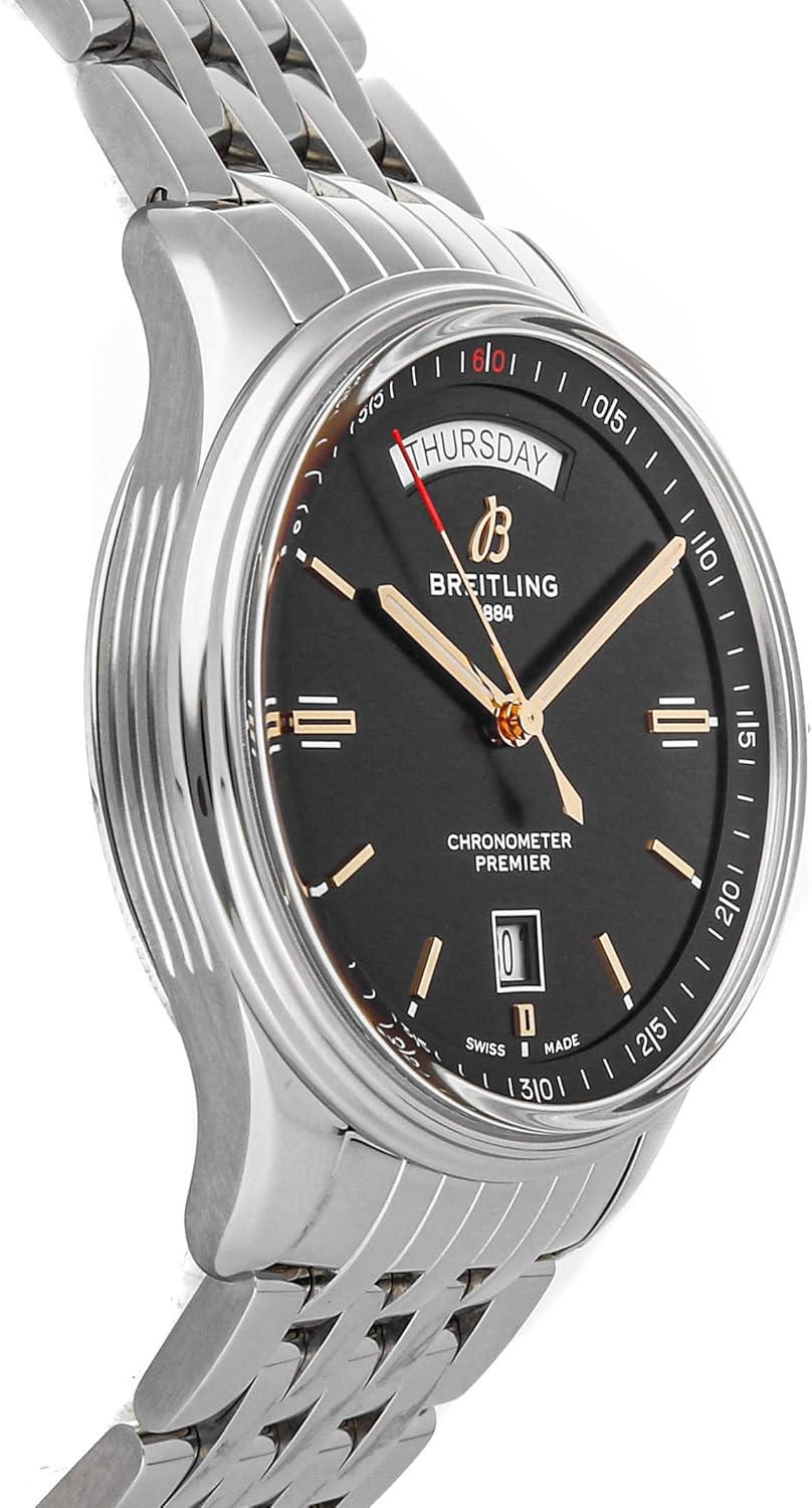 Breitlingプレミア自動巻き曜日&日付(A45340241B1A1)自動巻き自動巻き腕時計は、折りたたみバックル付きのステンレススチールブレスレットのブラックダイヤルを囲む40mmのステンレススチールケースが特徴です。 機能には、時間、分、秒、曜日と日付が含まれます。 この時計は箱と紙が付属しています。 ほとんどの時間は工場保証に残っています! 1884年にLeon Breitlingによって設立された同社は、産業および科学目的のカウンターとクロノグラフのメーカーとして概念化されました。 10年も経たないうちに、Breitlingがその革新的デザインと機能性によって「ヒット」になったことが明らかになりました。 同社の最も注目すべきクライアントには、アメリカ軍や主要な国際航空会社が含まれます。